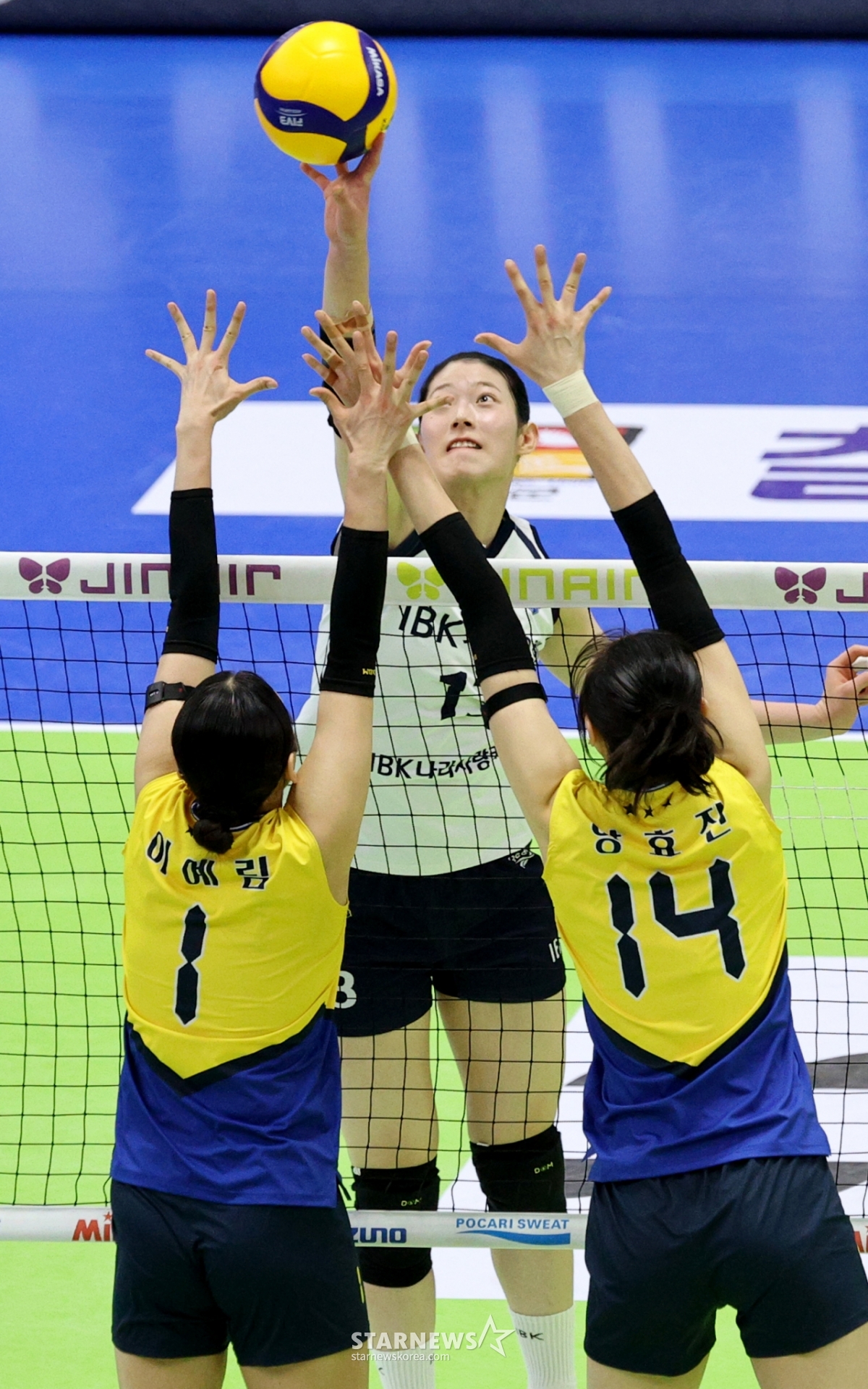 IBK 최정민이 28일 수원체육관에서 열린 여자부 현대건설과의 경기에서 밀어넣기를 성공시켰다.