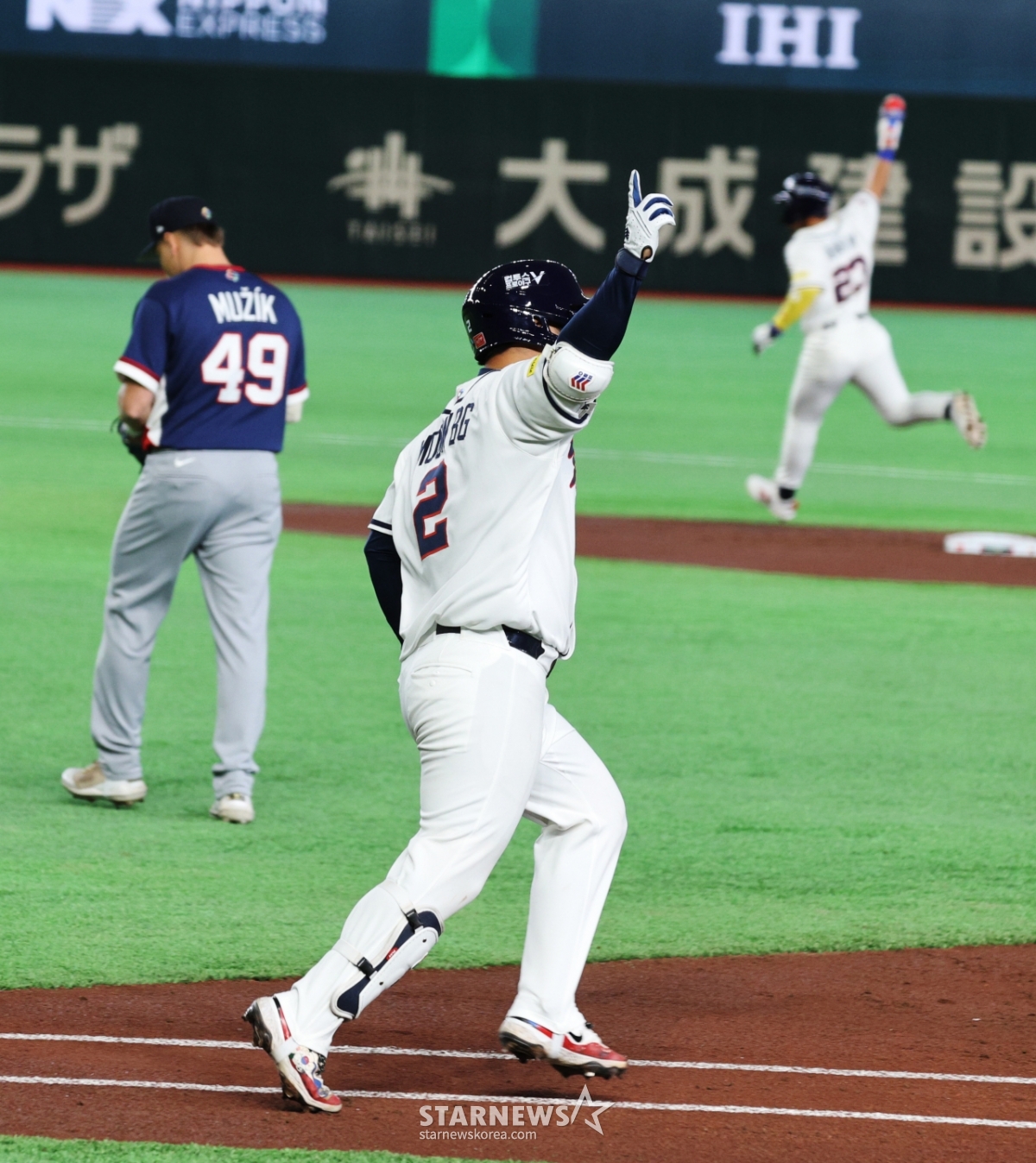 스포츠해외야구[포토]도쿄돔 잠장 넘긴 문보경발행 : 2026.03.05 ・ 19:42도쿄(일본)=강영조 선임기자야구대표팀 5번타자 문보경이 5일 도쿄돔에서 열린 2026WBC 도쿄POOL 개막 두번째경기 한국과 체코경기 1회말 1사 만루에서 만루홈런을 터트린 후 홈인 비행기 세리머니와 동료들의 격한 축하를 받고 있다. 2026.03.05.<저작권자 © 스타뉴스, 무단전재 및 재배포 금지>브리핑야구대표팀 5번타자 문보경이 5일 도쿄돔에서 열린 2026WBC 도쿄POOL 개막 두번째경기 한국과 체코 경기에서 만루홈런을 터트렸다. 그는 1회말 1사 만루 상황에서 홈런을 기록했다. 문보경은 홈인 후 비행기 세리머니와 동료들의 격한 축하를 받았다.추천 기사강영조 선임기자기자홈좋아요스포츠-해외야구의 인기 급상승 뉴스스포츠-해외야구의 최신 뉴스