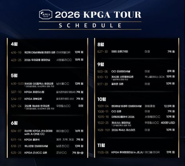한국프로골프투어(KPGT)가 지난 5일 2026시즌 KPGA 투어 일정을 발표했다. 올해 KPGA 투어는 20개 대회, 총상금 약 244억 원+@ 규모로 펼쳐진다. 그중 '코오롱 제68회 한국오픈'의 총상금은 추후 발표될 예정이다. 현재까지 대회당 평균 상금은 약 12.8억 원(3월 4일 환율 기준)이다.