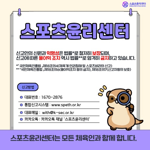 스포츠윤리센터는 "센터는 국민과 함께 스포츠윤리를 수호하는 체육인의 권익 보호를 위한 기관이다. 누구나 안심하고 신고할 수 있도록 신고인의 익명성을 최우선으로 보장하고 있다"라고 말했다.
