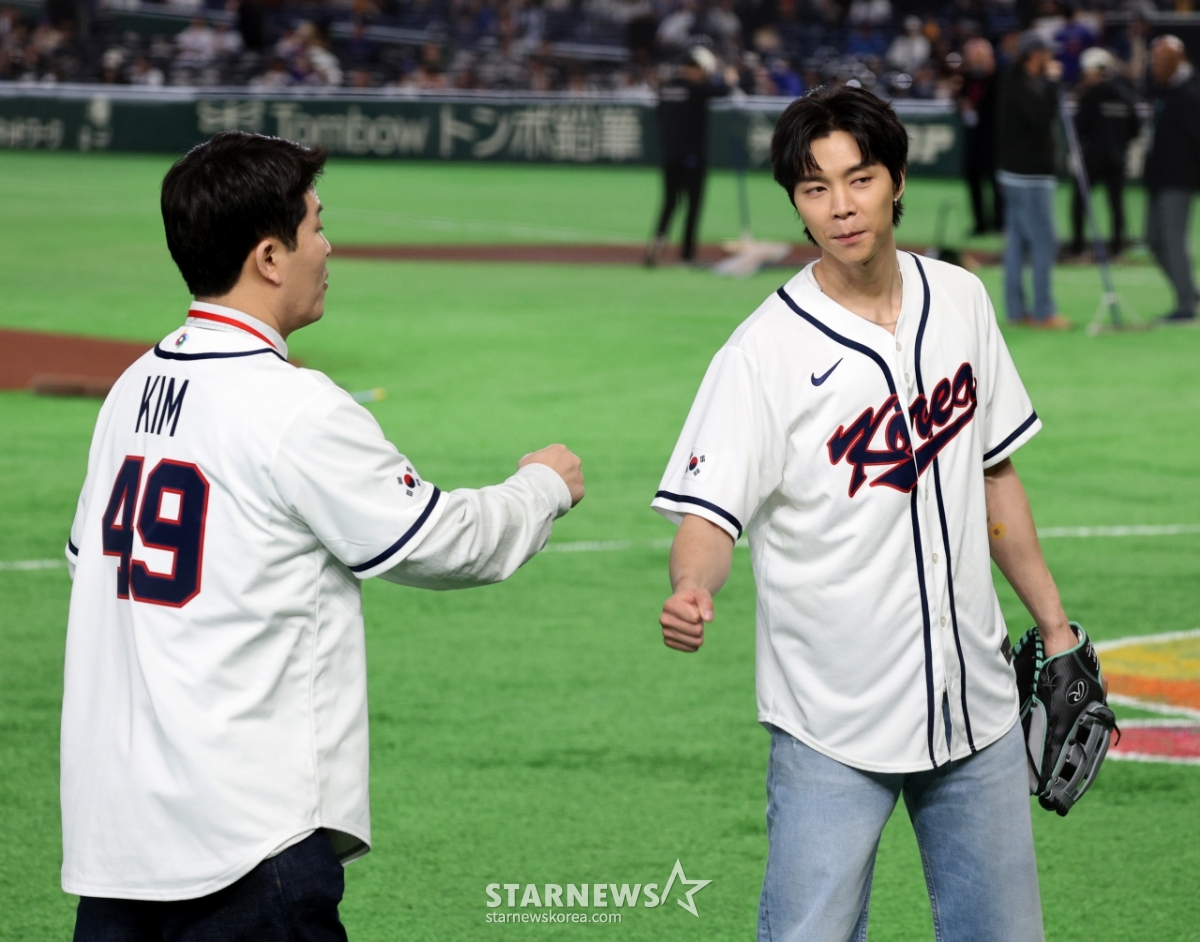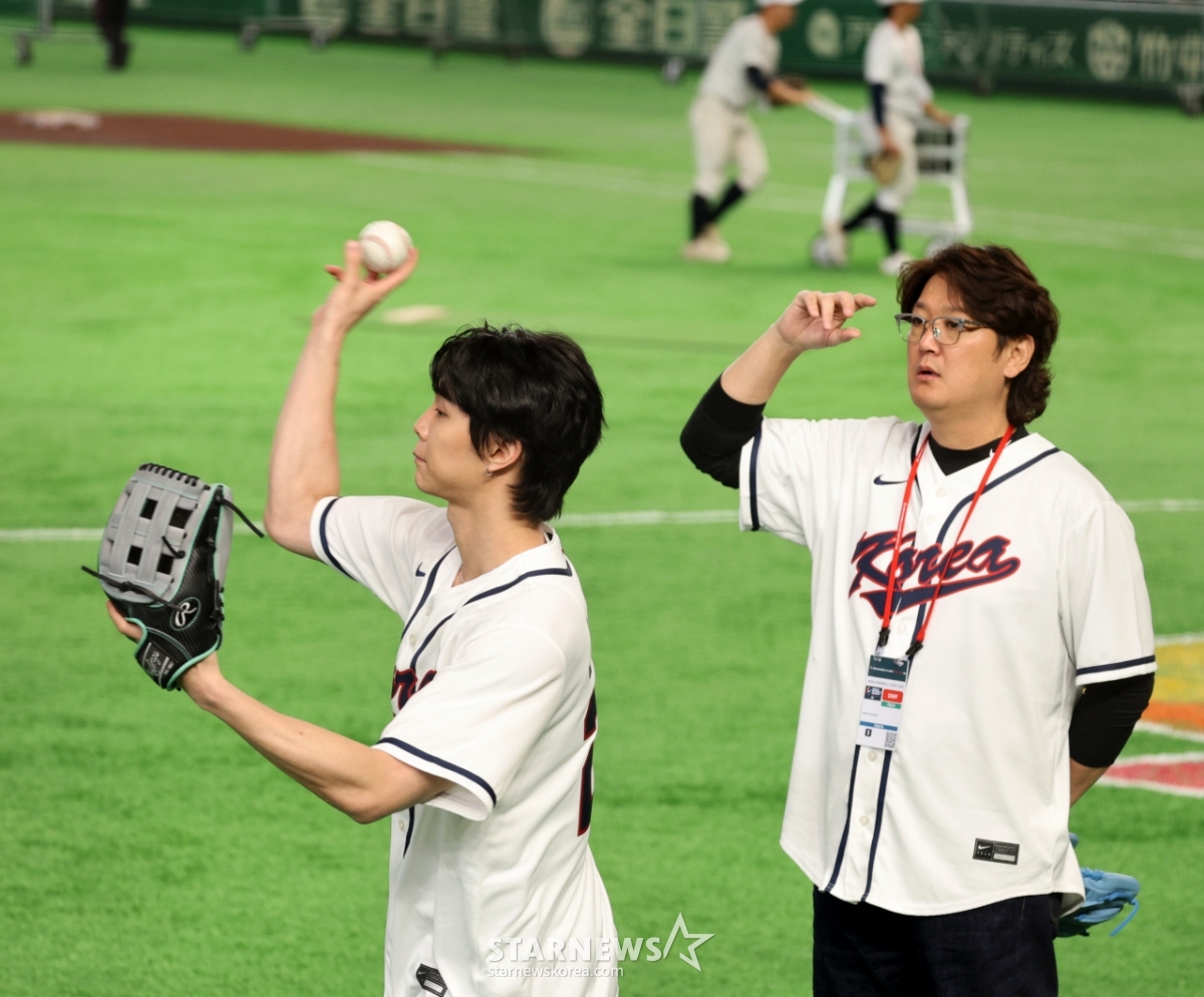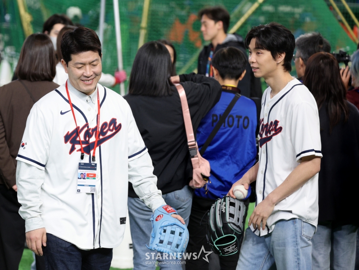 NCT 쟈니가 8일 도쿄돔에서 열린 2026 WBC 도쿄POOL 대한민국과 대만 경기 시구에 나서는 가운데 그라운드에 나와 시구 준비를 하고 있다. 김병현의 시구지도. 026.03.08.