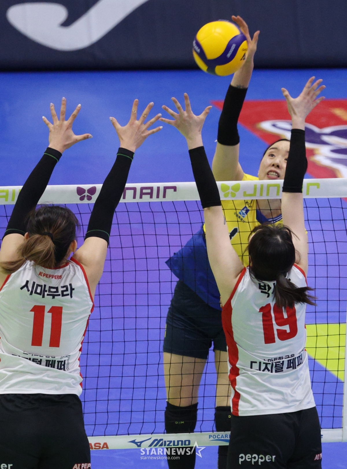 스포츠일반[포토] 이예림 '틀어치기 대마왕'발행 : 2026.03.08 ・ 16:55수원=김진경 대기자2025-2026 V-리그 여자부 현대건설 대 페퍼저축은행 경기가 8일 경기도 수원체육관에서 열렸다.현대건설 카리가 페퍼저축은행 시마무라, 박사랑의 블로킹 위로 강스파이크를 날리고 있다.<저작권자 © 스타뉴스, 무단전재 및 재배포 금지>브리핑2025-2026 V-리그 여자부 현대건설 대 페퍼저축은행 경기가 8일 경기도 수원체육관에서 열렸다. 현대건설 카리가 페퍼저축은행 시마무라, 박사랑의 블로킹 위로 강스파이크를 날렸다. 이예림 선수의 모습이 포착되었다.추천 기사김진경 대기자기자홈좋아요스포츠-일반의 인기 급상승 뉴스스포츠-일반의 최신 뉴스