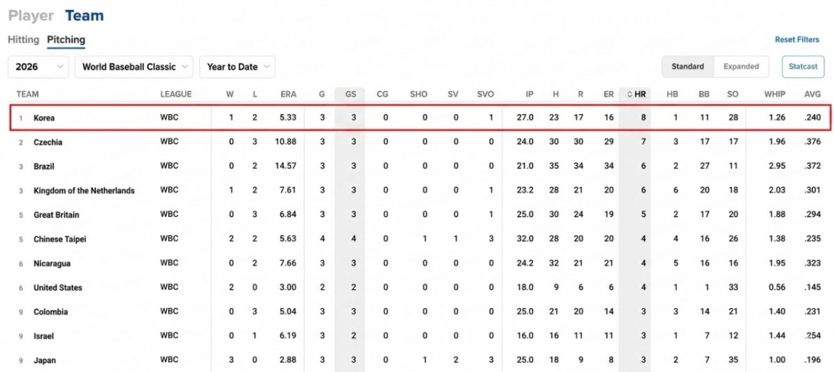 1라운드 C조 3경기를 치른 가운데 한국은 8개의 홈런을 내줘 이번 대회 참가 20개국 중 전체 1위라는 불명예스런 타이틀을 얻고 있다(한국시간 9일 오전 현재). 같은 조에서는 3전 전패의 최하위 체코가 7개로 한국의 뒤를 잇고, 대만은 4개, 일본은 3개, 호주는 단 1개의 홈런만을 허용했다.