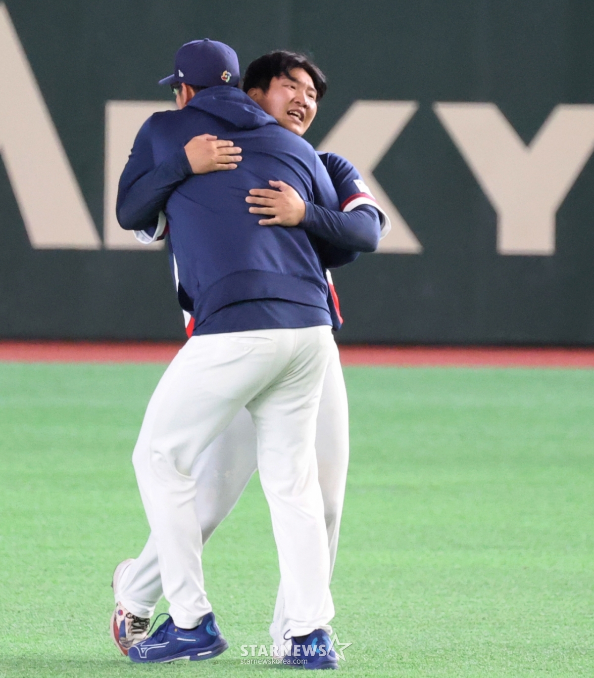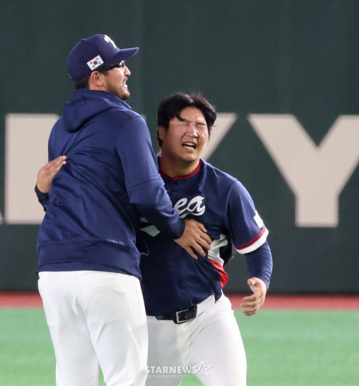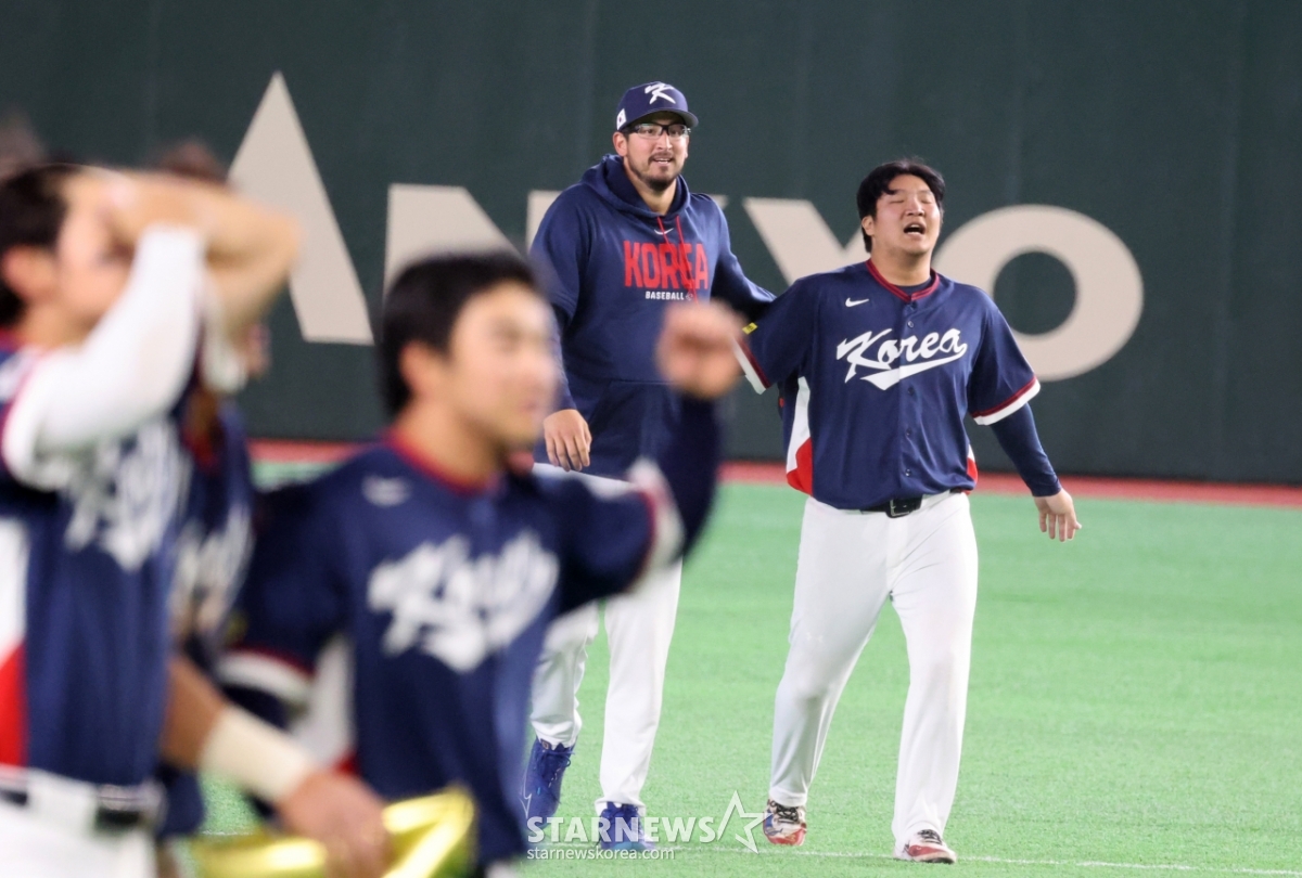 데인 더닝이 그라운드에 엎드려 울고 있는 문보경을 다독이고 있다.대한민국 야구대표팀이 9일 도쿄돔에서 열린 2026 WBC 도쿄POOL 대한민국과 호주 경기에서 7-2로 승리하며 마이애미행을 확정지었다. 아슬아슬하게 5점차 2실점을 유지한 쫄깃한 승부였다. 026.03.08.