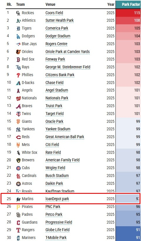 하지만 8강전이 열리는 론디포 파크는 사정이 완전히 다르다. 지난 2020년 하중 중심의 담장을 당기는 구장 규격 수정이 있었음에도 불구하고, 여전히 메이저리그 내에서 손꼽히는 투수 친화적인 구장으로 평가받는다. 메이저리그 공식 통계 시스템인 스탯캐스트(Statcast) 기반의 '베이스볼 서번트'에 따르면, 론디포 파크의 2025시즌 97에 불과했다. 이는 리그 평균(100)에 밑도는 수치로 메이저리그 30개 구장 중 25위에 해당하는 강력한 '홈런 억제력'을 보여준다.