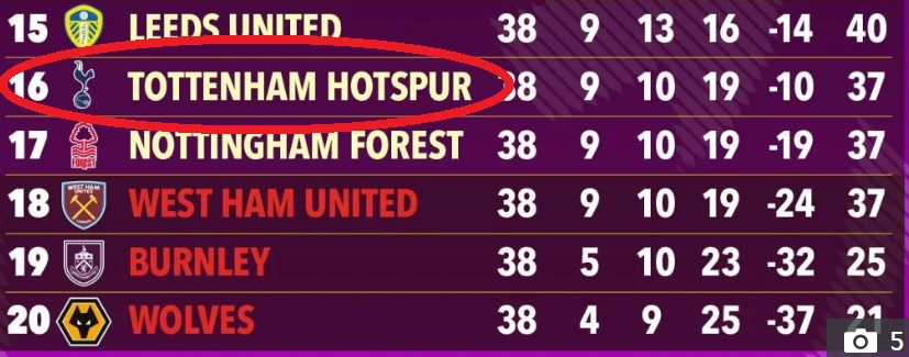 보도에 따르면 올 시즌 순위표 밑바닥의 생존 경쟁은 그 어느 때보다 암울하고 극적으로 전개될 전망이다. 슈퍼컴퓨터는 토트넘을 비롯해 노팅엄 포레스트, 웨스트햄이 모두 나란히 승점 37점으로 최종전을 마칠 것으로 내다봤다. 하지만 세 팀 중 골 득실에서 가장 뒤처진 웨스트햄이 18위를 기록하며 강등의 희생양이 될 것으로 예측됐다. 이에 토트넘은 지옥 문턱에서 간신히 살아남고, 웨스트햄은 번리, 울버햄튼 원더러스와 함께 강등의 고배를 마시게 된다.