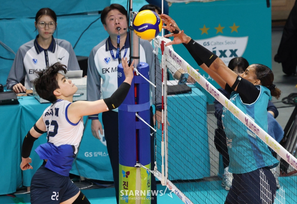 스포츠일반[포토] 서지혜 '실바 벽 높았다'발행 : 2026.03.18 ・ 20:08장충=김진경 대기자2025-2026시즌 V리그 여자부 GS칼텍스 대 현대건설 경기가 18일 서울 장충체육관에서 열렸다.현대건설 서지혜)왼쪽)이 연타를 시도했으나 GS칼텍스 실바에게 걸리고 있다.<저작권자 © 스타뉴스, 무단전재 및 재배포 금지>브리핑2025-2026시즌 V리그 여자부 GS칼텍스와 현대건설의 경기가 서울 장충체육관에서 열렸다. 현대건설의 서지혜 선수가 연타를 시도했다. 하지만 GS칼텍스의 실바 선수에게 막혔다.추천 기사김진경 대기자기자홈좋아요스포츠-일반의 인기 급상승 뉴스스포츠-일반의 최신 뉴스AD