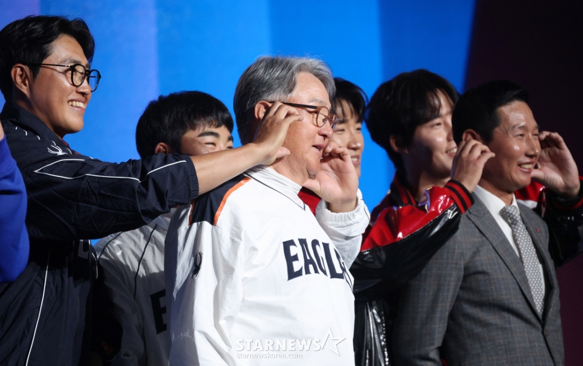 김경문 한화 감독과 염경엽 LG 감독이 선수들의 도움으로 하트 포즈를 취하고 있다.