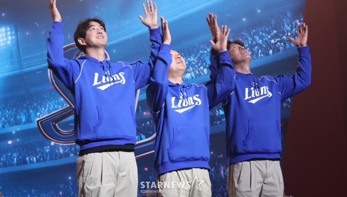 삼성 구자욱, 박진만 감독, 강민호가 팀 세리머니를 선보이고 있다.