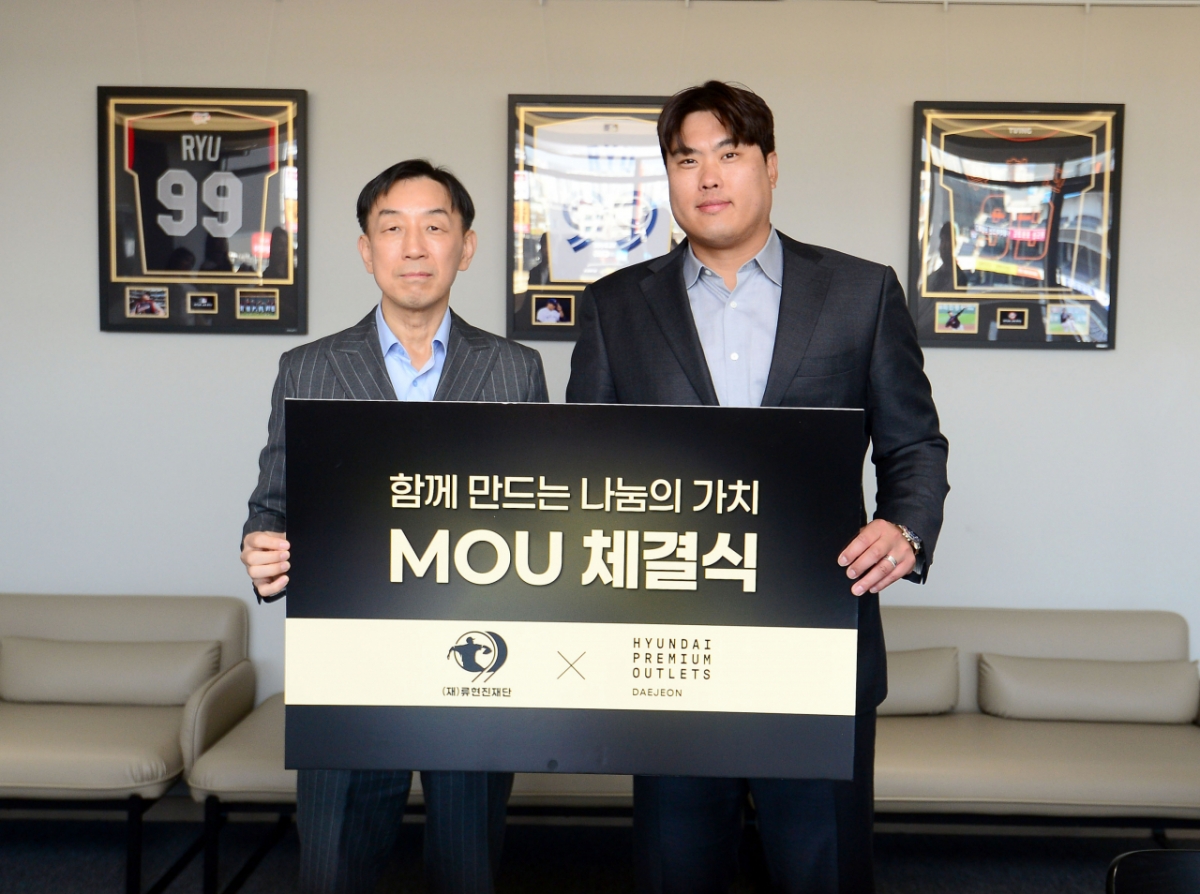 류현진재단이 지난 25일 현대프리미엄아울렛 대전점과 유소년 야구 지원 및 지역 협력 사업 추진을 위한 업무 협약(MOU)을 체결했다.
