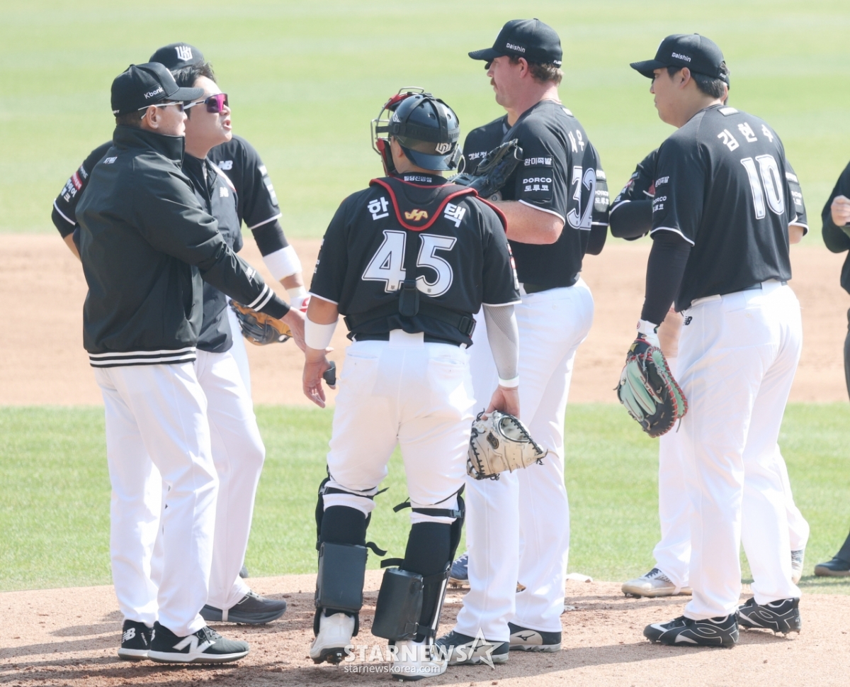 스포츠야구[포토] 이강철 감독 '사우어 정신차려'발행 : 2026.03.28 ・ 15:01잠실=김진경 대기자2026 신한 SOL Bank KBO리그 공식 개막전 LG 트윈스 대 KT 위즈 경기가 28일 서울 잠실야구장에서 열렸다.KT 선발 사우어가 흔들리는 모습을 보이자 이강철 감독이 마운드에 올라가 진정시키고 있다.<저작권자 © 스타뉴스, 무단전재 및 재배포 금지>브리핑28일 서울 잠실야구장에서 2026 신한 SOL Bank KBO리그 공식 개막전 LG 트윈스 대 KT 위즈 경기가 열렸다. KT 선발 사우어가 흔들리는 모습을 보였다. 이에 이강철 감독이 마운드에 올라가 사우어를 진정시켰다.추천 기사김진경 대기자기자홈좋아요스포츠-야구의 인기 급상승 뉴스스포츠-야구의 최신 뉴스AD
