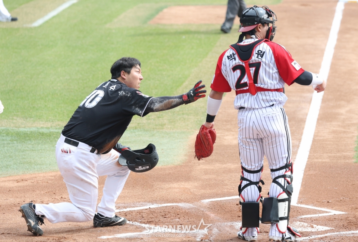 스포츠야구[포토] 김현수 '동원이 안 다쳤나'발행 : 2026.03.29 ・ 14:24잠실=김진경 대기자2026 신한 SOL Bank KBO리그 LG 트윈스 대 KT 위즈 경기가 29일 서울 잠실야구장에서 열렸다.KT 1회초 1사 1루에서 1루주자 김현수가 안현민의 2루타 때 홈으로 뛰어들며 선제 득점을 한 후 충돌한 LG 포수 박동원의 상태를 살피고고 있다.<저작권자 © 스타뉴스, 무단전재 및 재배포 금지>브리핑2026 신한 SOL Bank KBO리그 LG 트윈스와 KT 위즈의 경기가 29일 서울 잠실야구장에서 열렸다. KT의 김현수 선수가 1회초 1사 1루 상황에서 안현민 선수의 2루타 때 홈으로 뛰어들어 선제 득점을 했다. 득점 후 LG 포수 박동원 선수와 충돌한 김현수 선수가 박동원 선수의 상태를 살폈다.추천 기사김진경 대기자기자홈좋아요스포츠-야구의 인기 급상승 뉴스스포츠-야구의 최신 뉴스AD