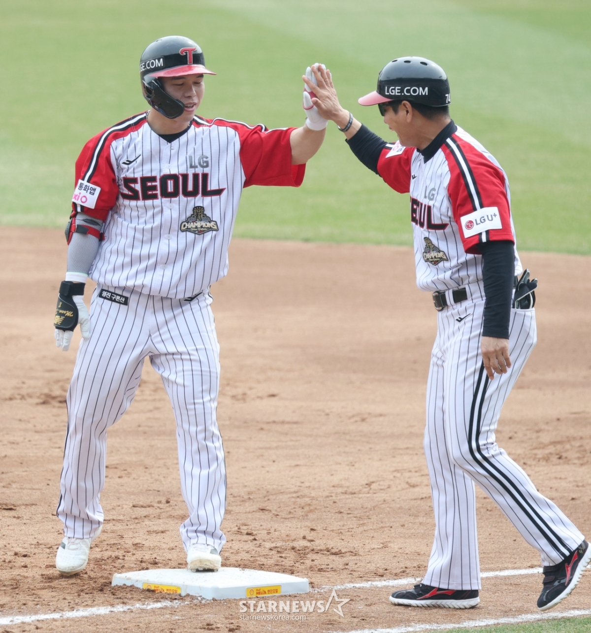 스포츠야구[포토] 문성주 '질 생각 없어요'발행 : 2026.03.29 ・ 16:08잠실=김진경 대기자2026 신한 SOL Bank KBO리그 LG 트윈스 대 KT 위즈 경기가 29일 서울 잠실야구장에서 열렸다.LG 문성주가 3회말 2사 1,2루에서 1타점 적시타를 날리고 출루한 후 송지만 코치의 환영을 받고 있다.<저작권자 © 스타뉴스, 무단전재 및 재배포 금지>브리핑2026 신한 SOL Bank KBO리그 LG 트윈스와 KT 위즈의 경기가 29일 서울 잠실야구장에서 열렸다. LG 문성주가 3회말 2사 1,2루 상황에서 1타점 적시타를 날렸다. 문성주는 출루 후 송지만 코치의 환영을 받았다.추천 기사김진경 대기자기자홈좋아요스포츠-야구의 인기 급상승 뉴스스포츠-야구의 최신 뉴스AD