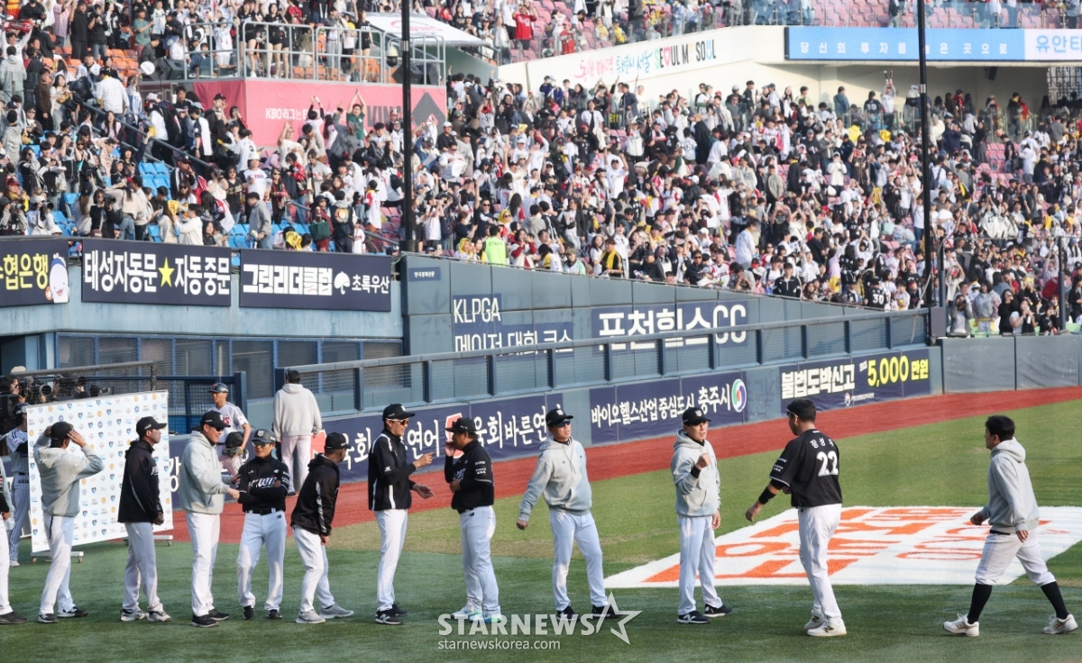 스포츠야구[포토] 이강철 감독 '이 기세로 수원 간다'발행 : 2026.03.29 ・ 17:48잠실=김진경 대기자2026 신한 SOL Bank KBO리그 LG 트윈스 대 KT 위즈 경기가 29일 서울 잠실야구장에서 열렸다.KT 선수들이 LG에 6-5로 역전승 한 후 이강철 감독과 하이파이브하고 있다.<저작권자 © 스타뉴스, 무단전재 및 재배포 금지>브리핑2026 신한 SOL Bank KBO리그 LG 트윈스와 KT 위즈의 경기가 29일 서울 잠실야구장에서 열렸다. KT 선수들은 LG에 6-5로 역전승을 거두었다. 경기 후 KT 선수들은 이강철 감독과 하이파이브를 했다.추천 기사김진경 대기자기자홈좋아요스포츠-야구의 인기 급상승 뉴스스포츠-야구의 최신 뉴스AD