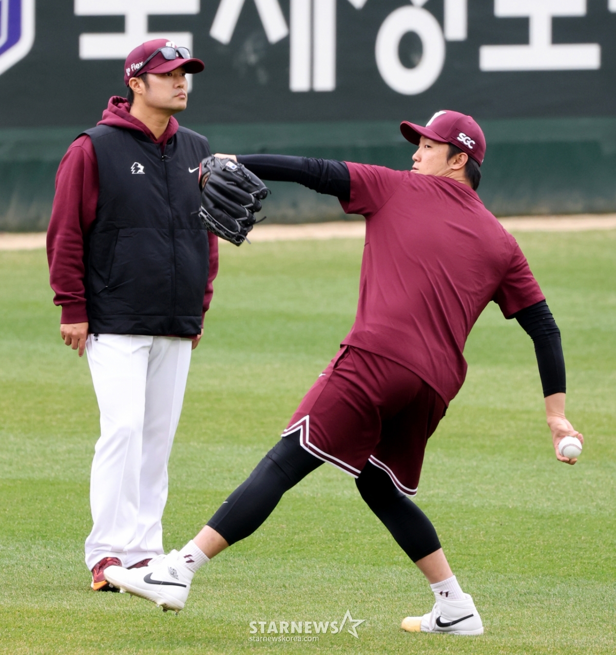 키움 에이스 안우진이 31일 인천SSG랜더스필드에서 열리는 2026 프로야구 SSG랜더스와 키움히어로즈의 경기에 앞서 캐치볼로 몸을 풀었다. 안우진은 부상에서 회복 중이었다. 그는 1군과 동행했다.
