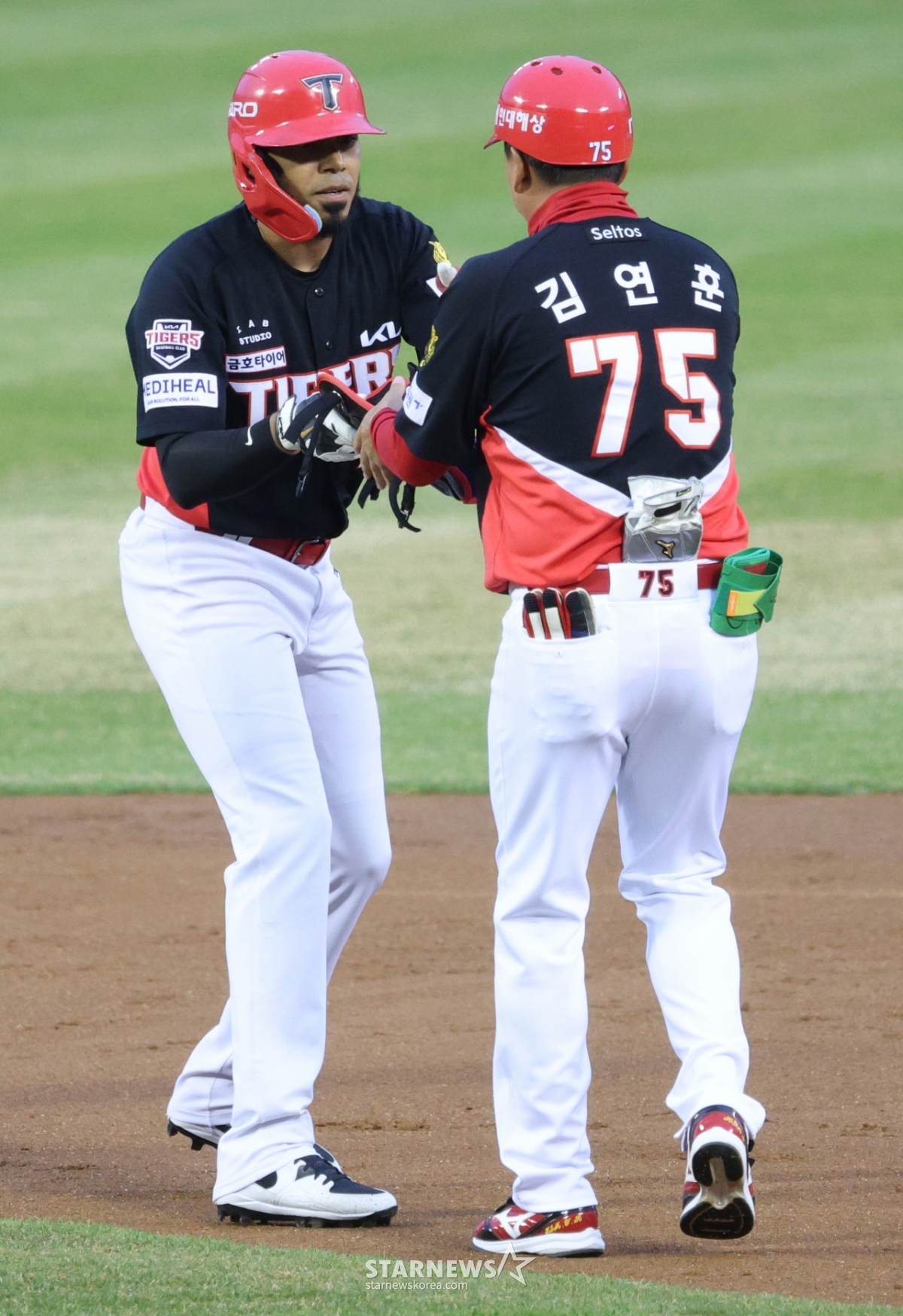 KIA 카스트로가 1회초 1사에서 우월 2루타를 날리고 출루한 후 김연훈 코치의 환영을 받고 있다.