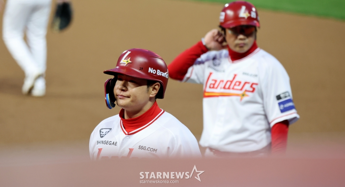 랜더스 4번타자 김재환이 31일 인천SSG랜더스필드에서 열리는 2026 프로야구 SSG랜더스와 키움히어로즈의 경기 2회말 선두타자로 나와 범타로 물러나며 더그아웃으로 향하고 있다. 10타석 볼넷하나를 얻어내며 무안타를 기록중인 김재환. 2026.03.31.