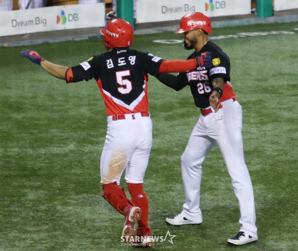 KIA 김도영이 2회초 2사 2루에서 좌월 2점 홈런을 날리고 홈인한 후 카스트로와 기쁨을 나누고 있다.