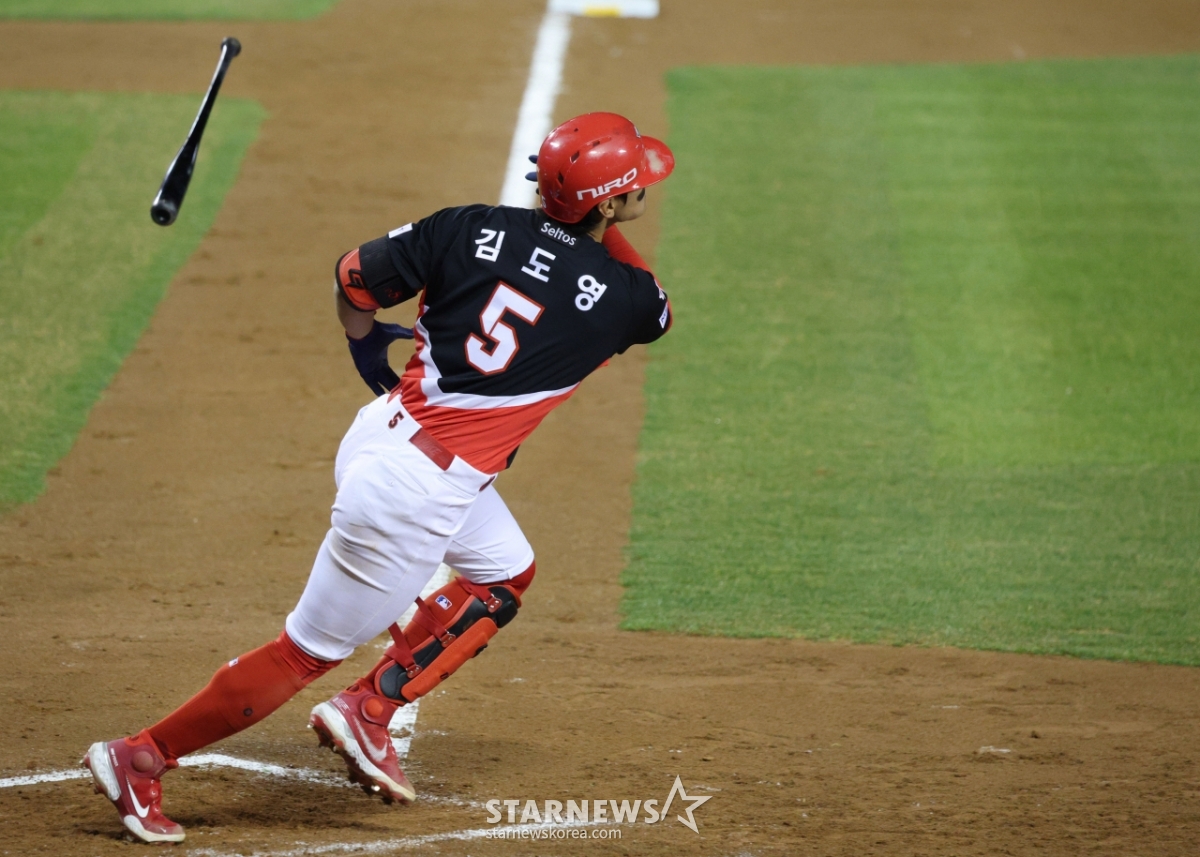 KIA 김도영이 4회초 무사에서 호쾌한 타격을 하고 있다.