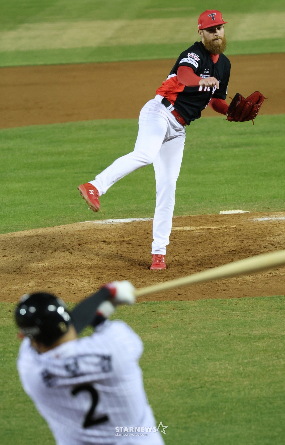 2026 신한 SOL Bank KBO리그 LG 트윈스와 KIA 타이거즈의 경기가 31일 서울 잠실야구장에서 열렸다. KIA 선발 올러는 4회말 2사 상황에서 LG 문보경을 삼진으로 잡았다. 올러는 문보경을 가볍게 삼진으로 돌려세웠다.