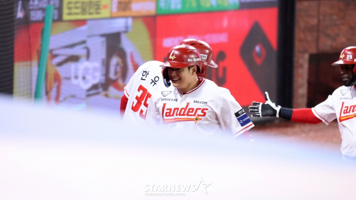 랜더스 4번타자 김재환이 31일 인천SSG랜더스필드에서 열리는 2026 프로야구 SSG랜더스와 키움히어로즈의 경기 7회말 1사 1,2루에서 쐐기 3점홈런을 터트린 후 홈인하고 있다. 2026.03.31.