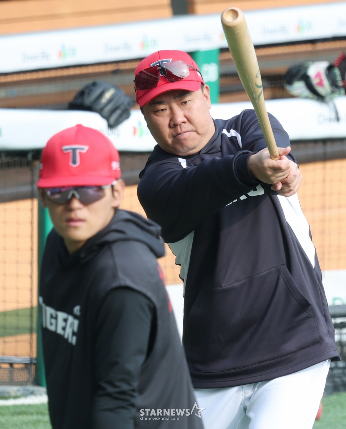 2026 신한 SOL Bank KBO리그 LG 트윈스와 KIA 타이거즈의 경기가 1일 서울 잠실야구장에서 열렸다. KIA 이범호 감독이 윤도현과 김도영을 상대로 타격 특강을 했다. 김도영 뒤에서 이범호 감독이 풀스윙을 하는 모습이 포착됐다.