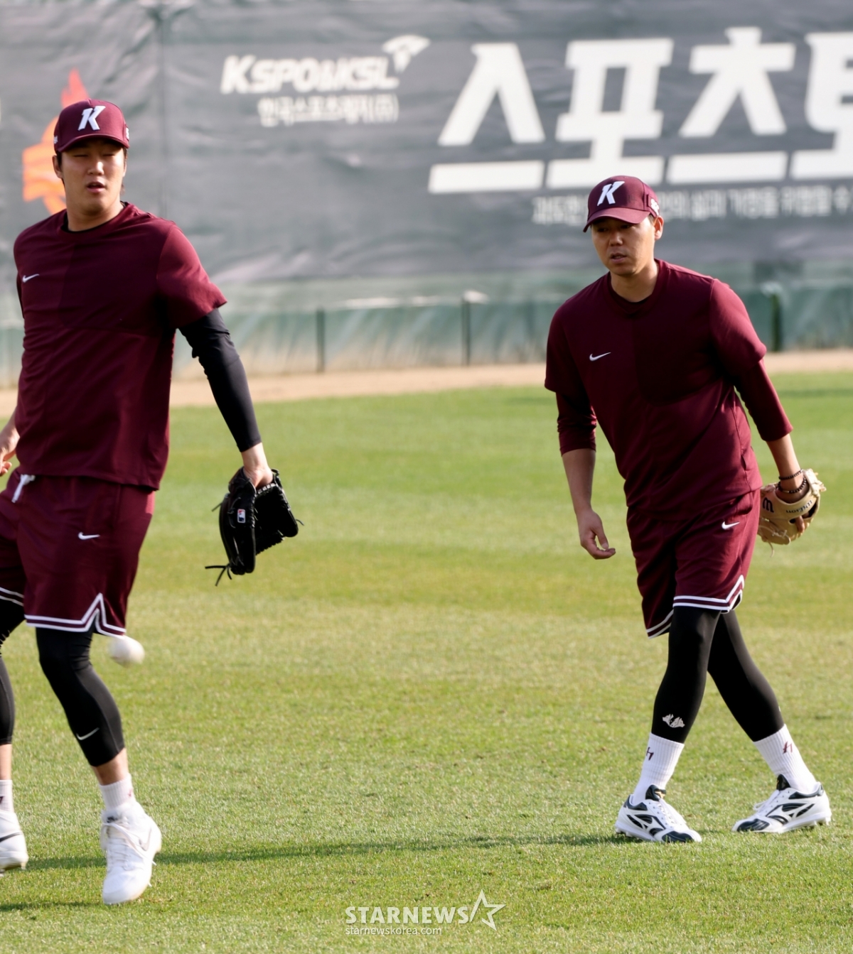 부상회복 훈련을 이어가고 있는 안우진이 1일 인천SSG랜더스필드에서 열리는 2026 프로야구 SSG랜더스와 키움히어로즈의 경기를 앞두고 하영민이 지켜보는 가운데 외야에서 피칭을 하고 있다. 타격케이지에서 날아온 타구를 피하는 안우진. 2026.04.01.