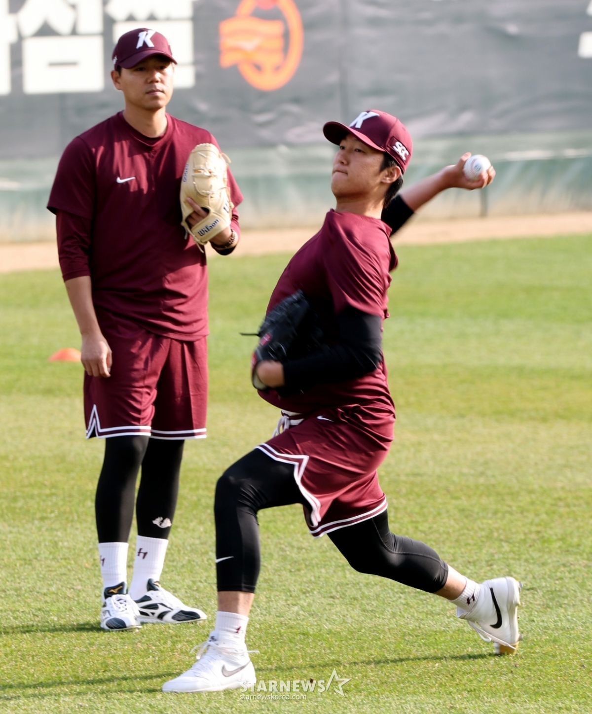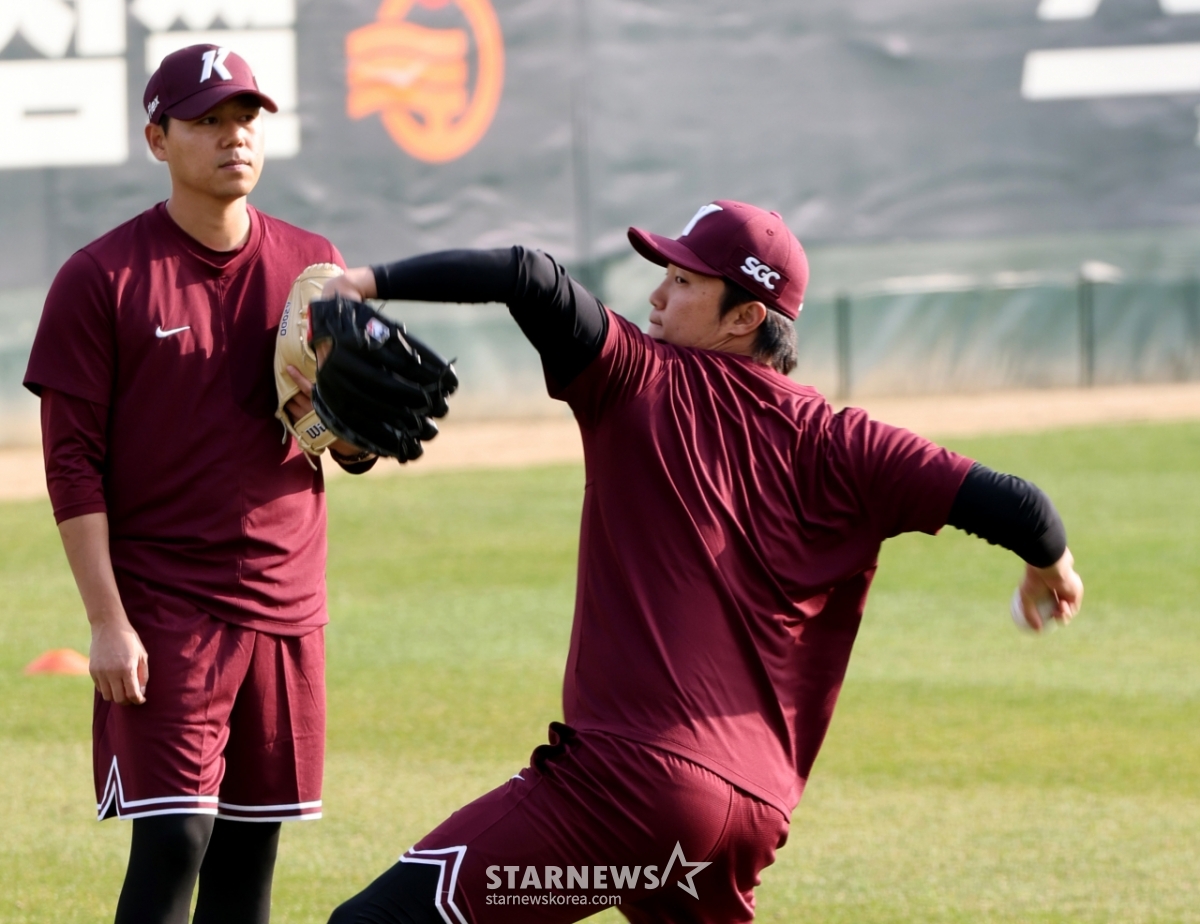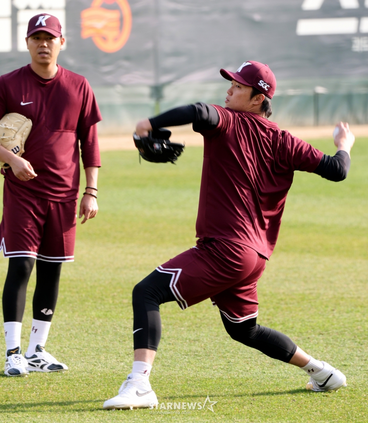 부상회복 훈련을 이어가고 있는 안우진이 1일 인천SSG랜더스필드에서 열리는 2026 프로야구 SSG랜더스와 키움히어로즈의 경기를 앞두고 하영민이 지켜보는 가운데 외야에서 피칭을 하고 있다. 2026.04.01.