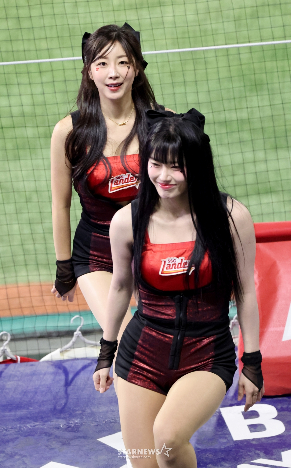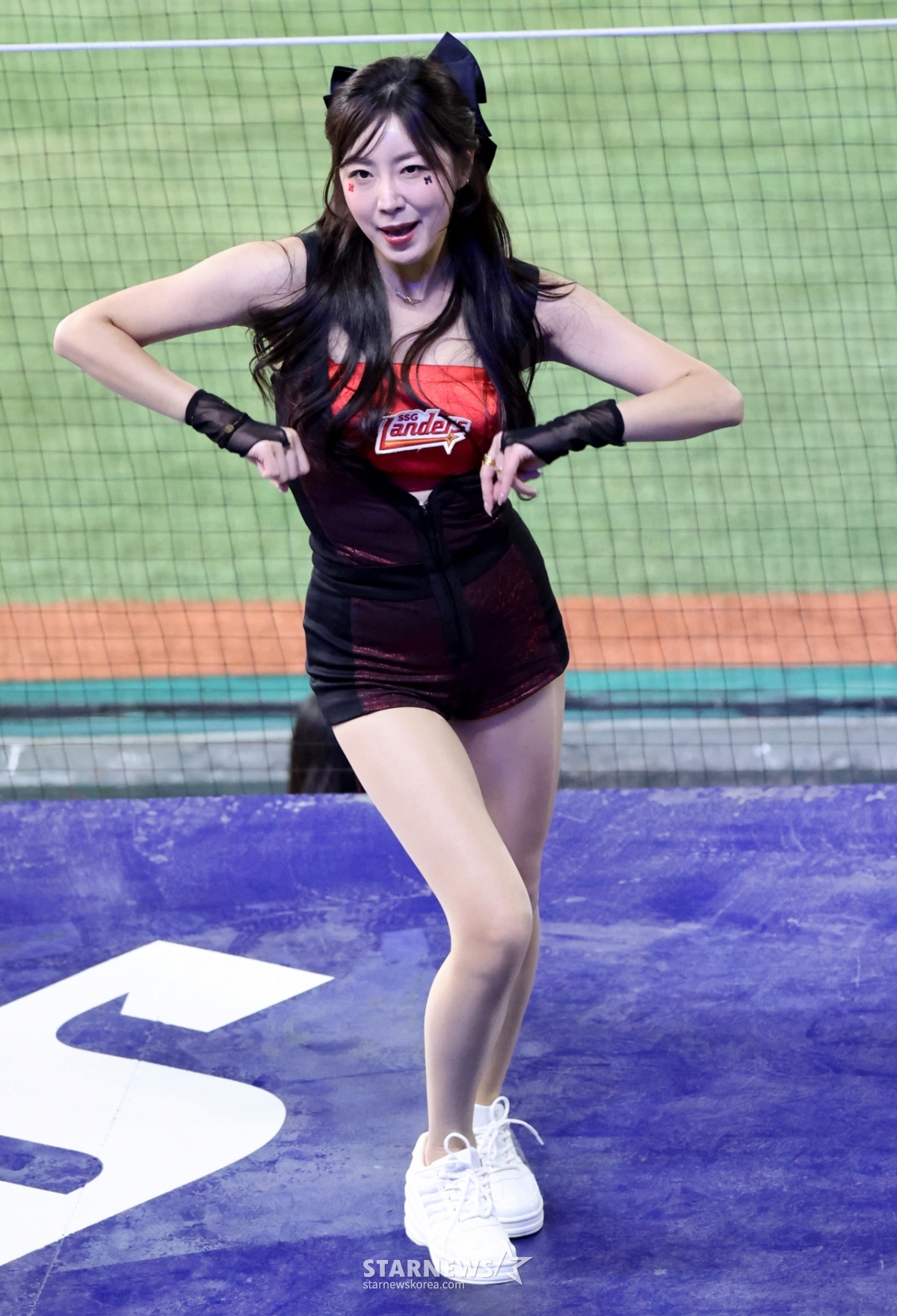 랜더스 치어리더 안지현이 1일 인천SSG랜더스필드에서 열리는 2026 프로야구 SSG랜더스와 키움히어로즈의 경기에서 조다정, 강지은과 공연을 펼치고 있다.. 2026.04.01.