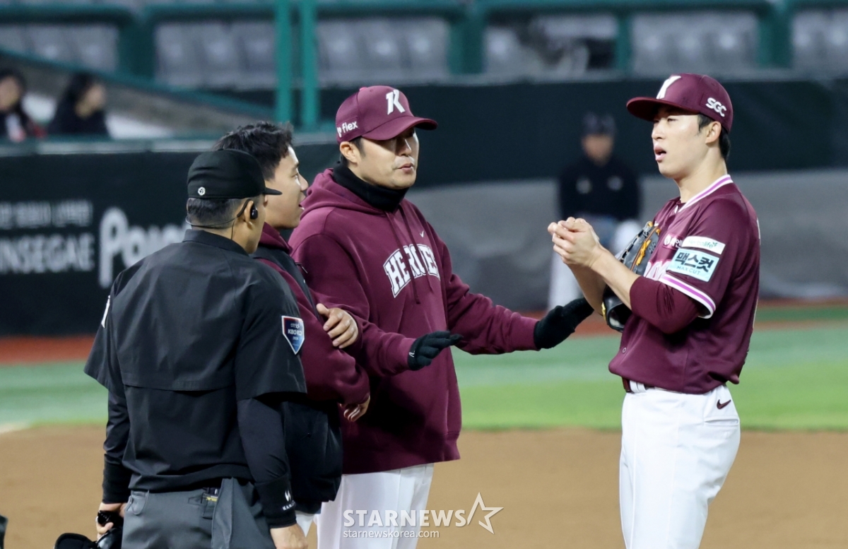 키움 선발투수 배동현이 1일 인천SSG랜더스필드에서 열린 SSG랜더스와 키움히어로즈의 경기 5회말 에레디아의 타구에 정강이쪽을 맞았다. 하지만 배동현은 괜찮다며 손짓했다. 배동현은 5이닝 무실점을 이어갔고, 6회까지 키움이 7-0으로 앞서고 있었다.