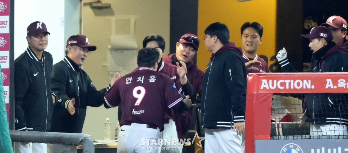 키움 안치홍이 1일 인천SSG랜더스필드에서 열리는 2026 프로야구 SSG랜더스와 키움히어로즈의 경기 5회초 1타점 2루타로 출루한 후 득점하자 설종진 감독과 코치들이 반기고 있다. 2026.04.01.