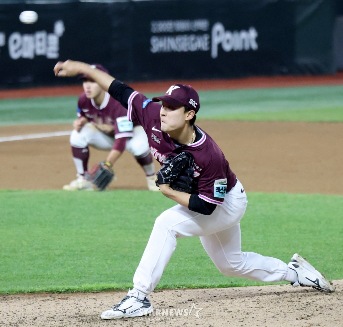키움 우완불펜 박윤성이 1일 인천SSG랜더스필드에서 열리는 2026 프로야구 SSG랜더스와 키움히어로즈의 경기 6회말 무사 1,2루에 등판 역투하고 있다. 2026.04.01.