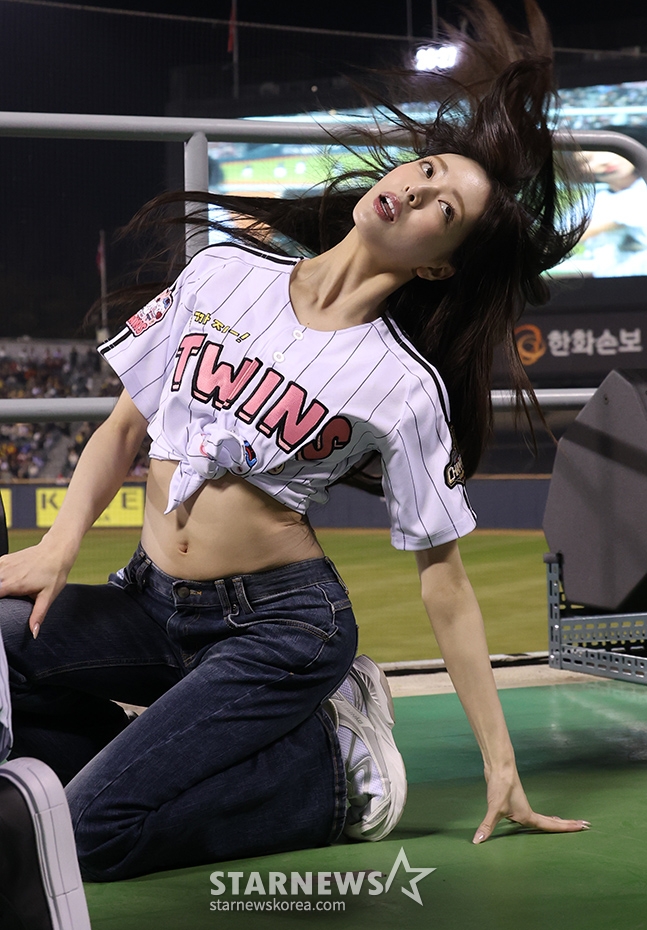 2026 신한 SOL Bank KBO리그 LG 트윈스 대 KIA 타이거즈 경기가 1일 서울 잠실야구장에서 열렸다. LG 승리기원 시구자로 나선 있지(ITZY) 유나가 클리닝타임 때 응원단상에 올랐다. 유나는 응원단상에서 치어리딩을 했다.