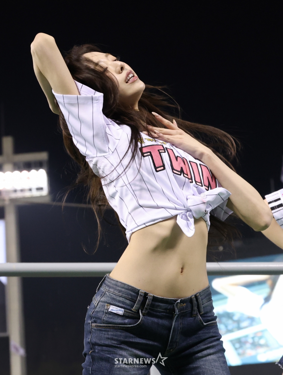 2026 신한 SOL Bank KBO리그 LG 트윈스와 KIA 타이거즈 경기가 1일 서울 잠실야구장에서 열렸다. LG 승리기원 시구자로 나선 있지 유나가 클리닝타임에 응원단상에 올랐다. 유나는 응원단상에서 치어리딩을 했다.