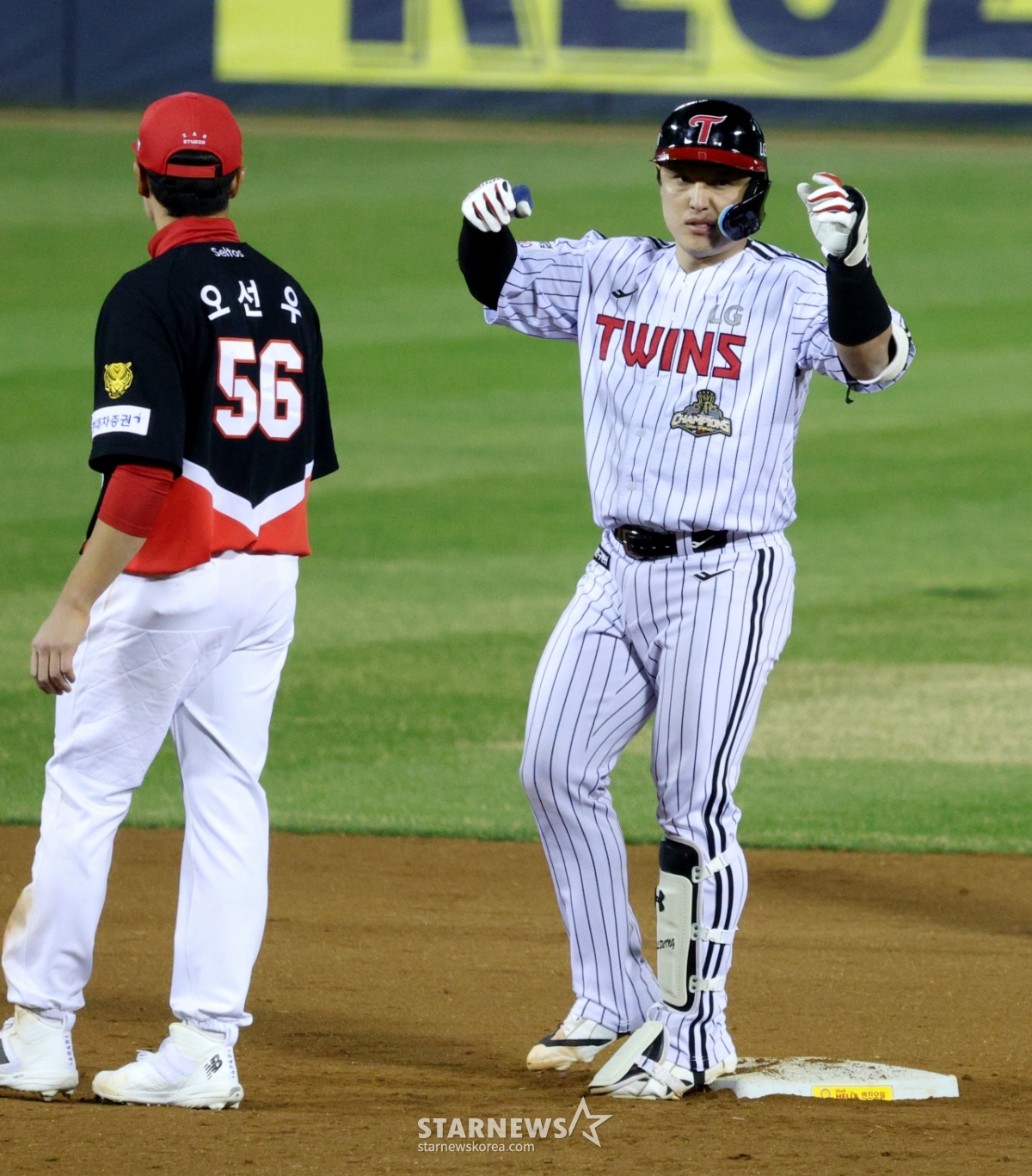 LG 박동원이 8회말 2사 2,3루에서 주자일소 2타점 적시 2루타를 날리고 출루한 후 세리머니를 하고 있다.