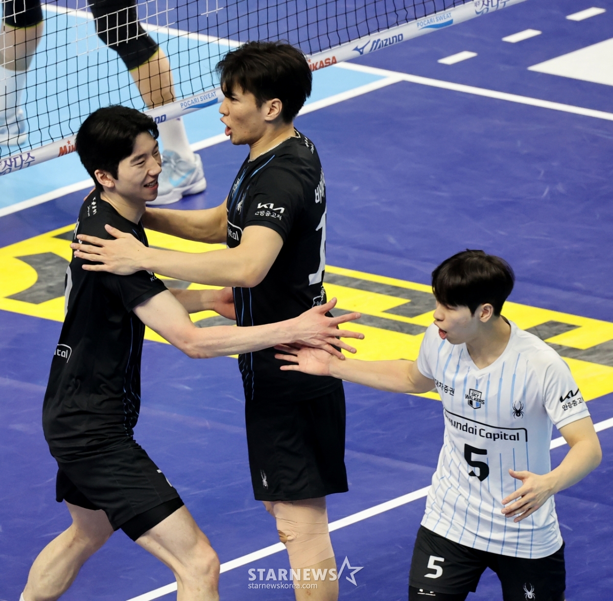 현대 허수봉과 선수들이 3일 계양체육관에서 열린 진에어 2025-2026 V리그 챔피언결정전 대한항공과 현대캐피탈 경기에서 득점하며 자축하고 있다. 2026.04.03.