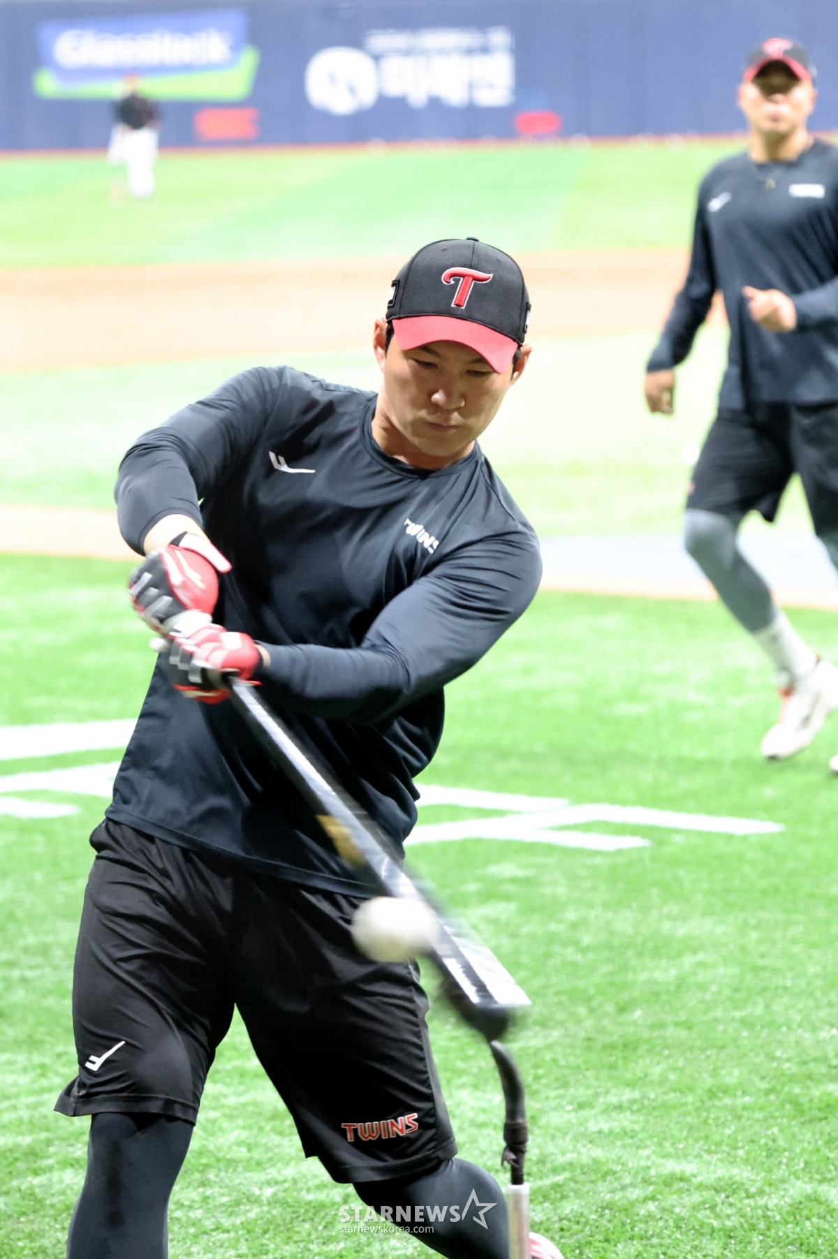 LG 유격수 오지환이 4일 고척스카이돔에서 열린 2026KBO리그 키움히어로즈와 LG트윈스 경기를 앞두고 타격훈련을 하고 있다. 오지환은 타율이 6푼7리로 시즌 출발이 저조하다. 2026.04.03.