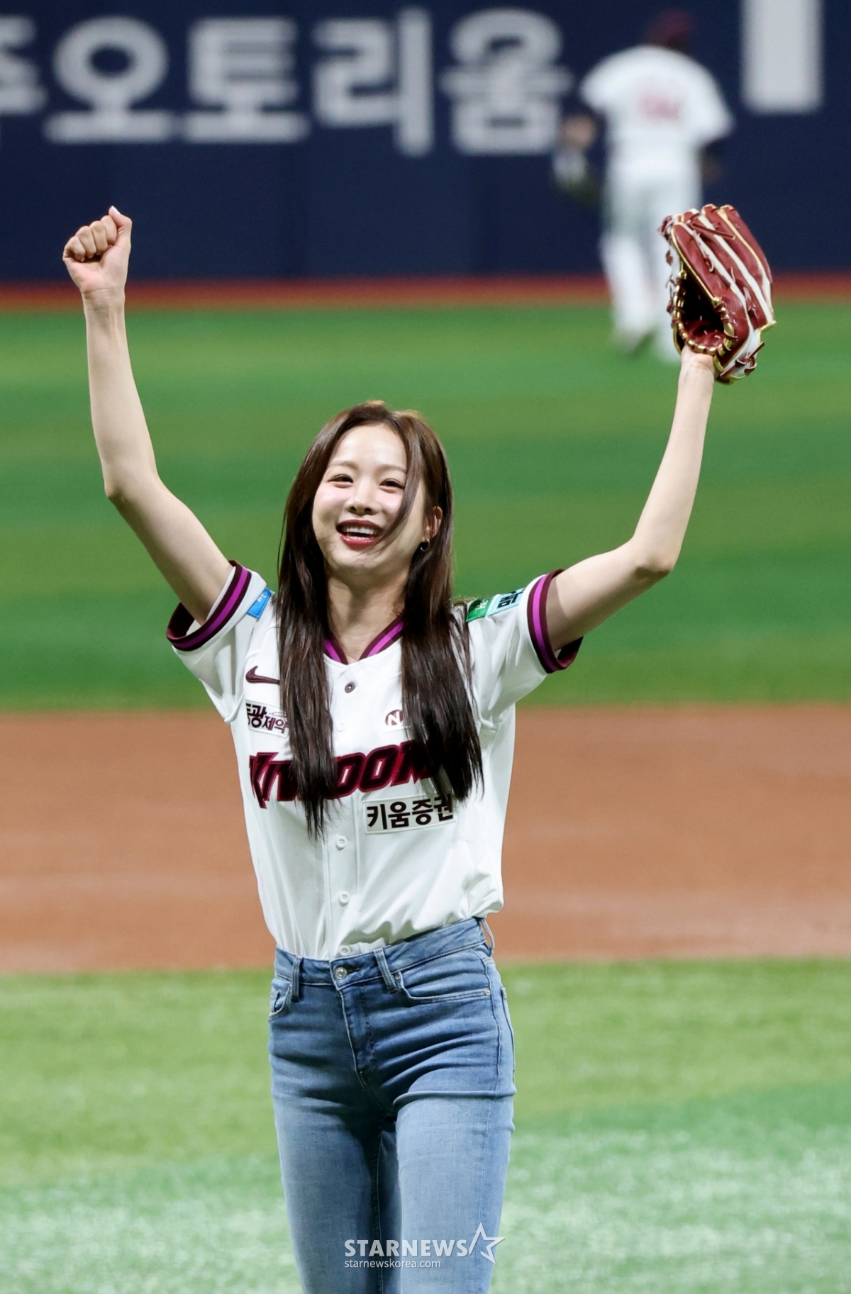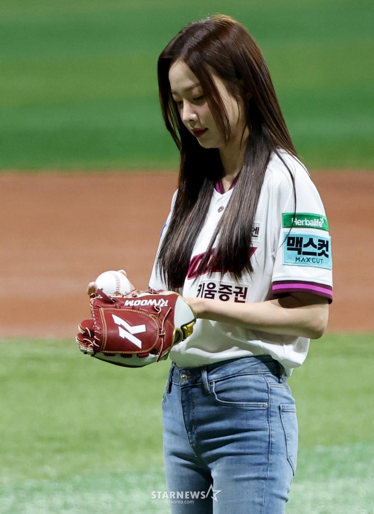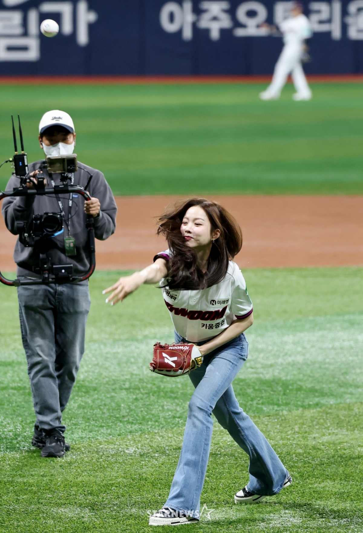 키움히어로즈 1호 엔터히어로 솔지가 4일 여척스카이돔에서 열린 2026KBO리그 키움히어로즈와 LG트윈스 경기에서 시구를 하고 있다. 202604.03.