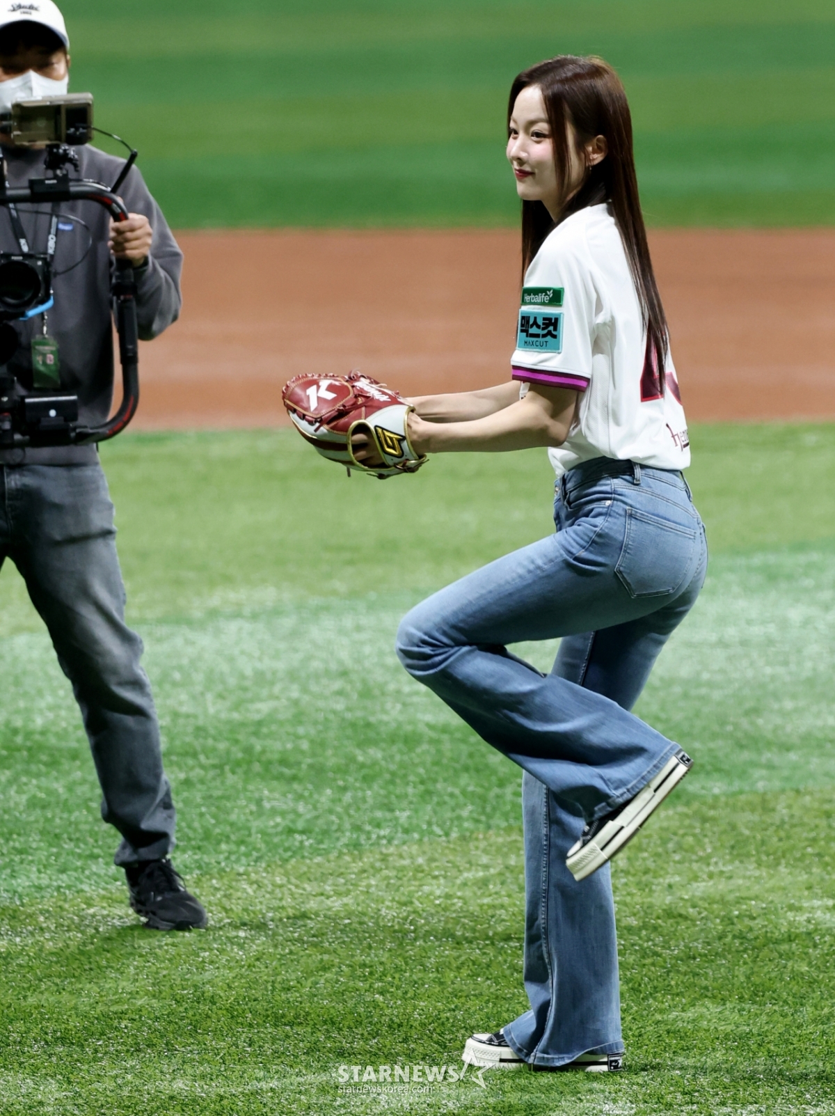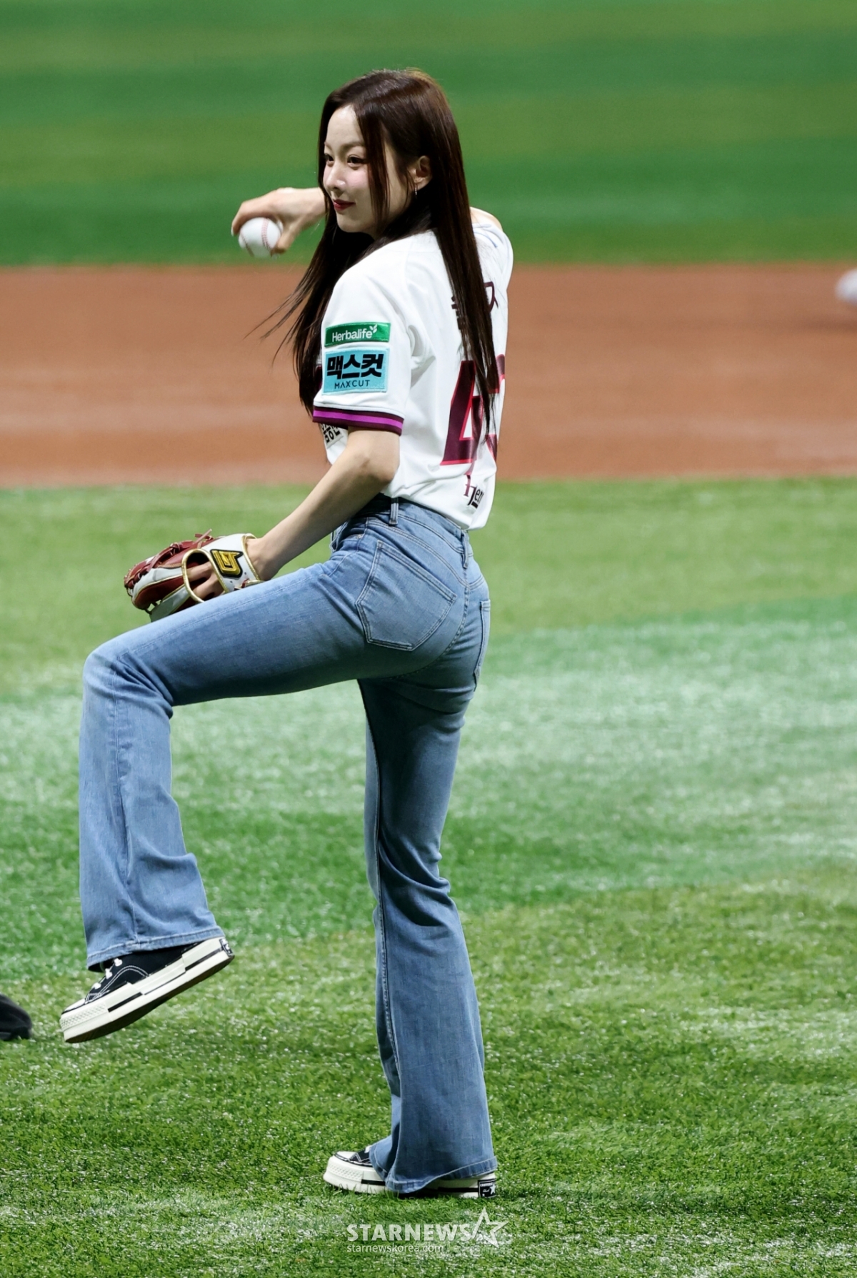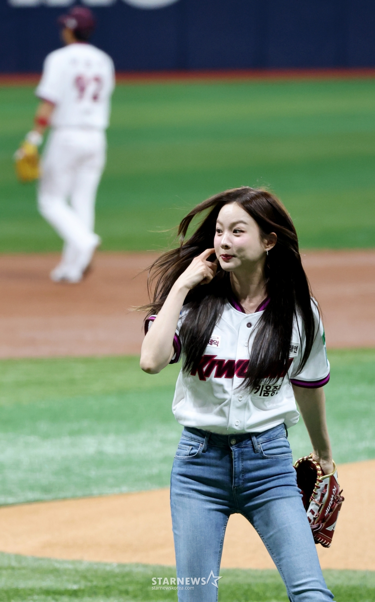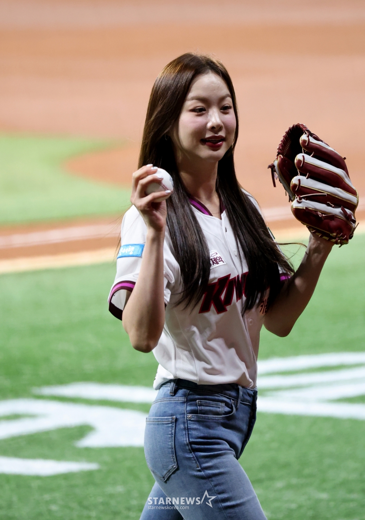 솔지가 4일 고척스카이돔에서 열린 2026KBO리그 키움히어로즈와 LG트윈스 경기에서 시구를 했다. 그녀는 베테랑 시구자답게 물 흐르듯 투구 동작을 이어갔다. 솔지는 깨알 화이팅을 외치며 인사를 했다.