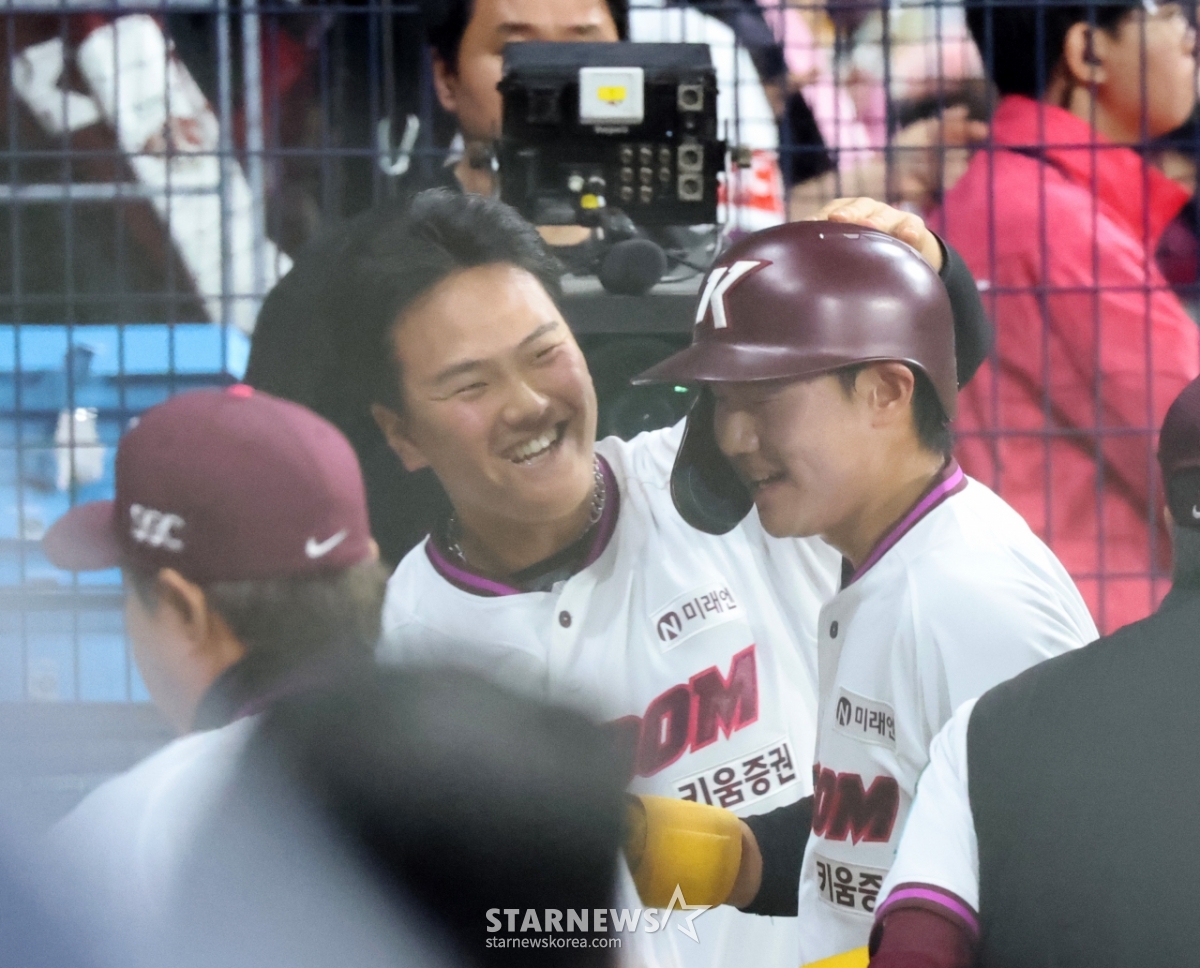 키움 9번타자 박한결이 4일 고척스카이돔에서 열린 2026KBO리그 키움히어로즈와 LG트윈스 경기 3회말 무사 2,3루에서 이주형 1타점 적시타에 득점하자 김건희가 축하하고 있다. 202604.03.