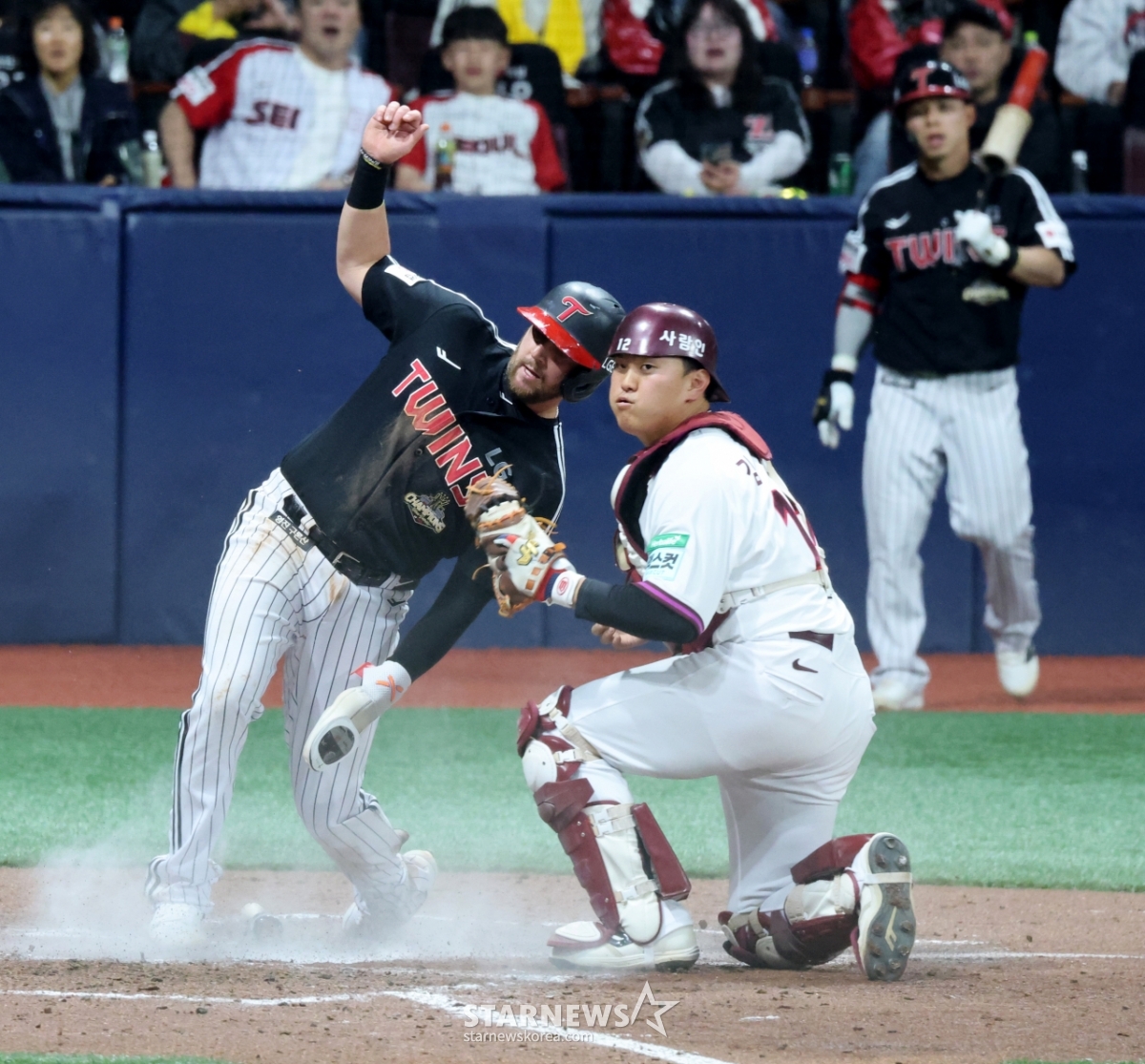 LG 4번타자 오스틴이 4일 여척스카이돔에서 열린 2026KBO리그 키움히어로즈와 LG트윈스 경기 6회초 1사 3루 박동원 3루수앞 땅볼때 홈에서 태그아웃되고 있다. 202604.03.