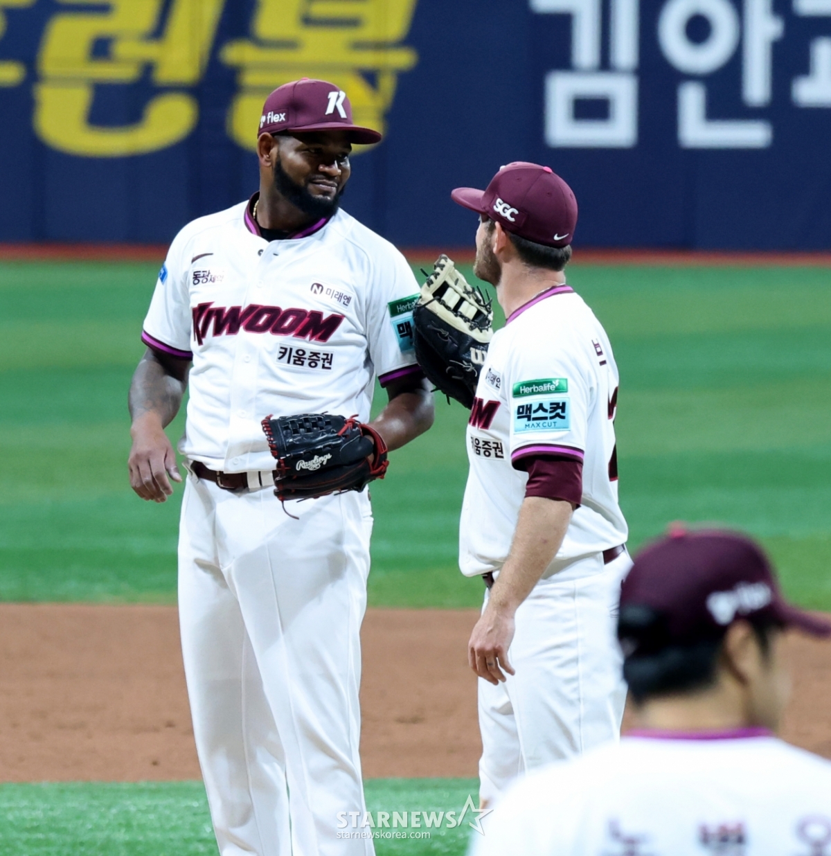 키움 선발투수 알칸타라가 4일 여척스카이돔에서 열린 2026KBO리그 키움히어로즈와 LG트윈스 경기 7회초 1사 후 투구수가 96개에 이르자 교체됐다. 알칸타라는 6과 1/3이닝 1실점 호투를 펼쳤다. 그는 유토로 교체되며 브룩스와 눈빛을 교환했다.