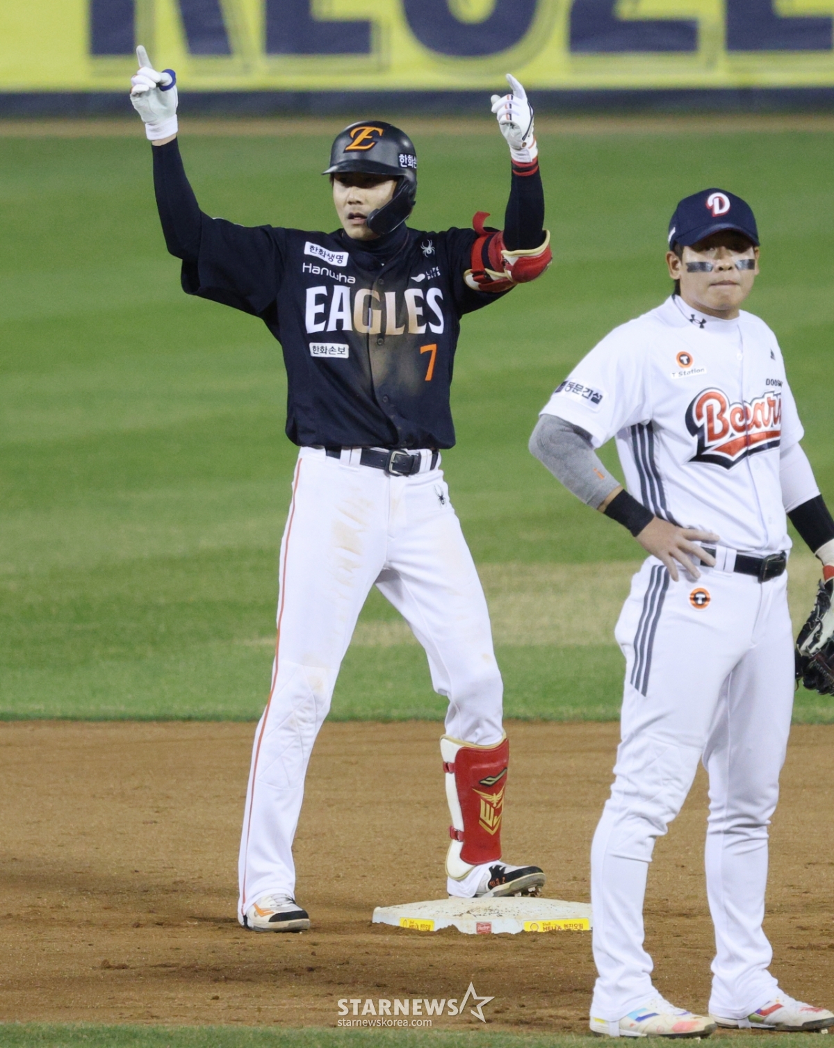 2026 신한 SOL KBO리그 두산 베어스와 한화 이글스의 경기가 3일 서울 잠실야구장에서 열렸다. 한화 심우준은 7회초 1사 1루 상황에서 우월 2루타를 날렸다. 심우준은 출루 후 세리머니를 했다.
