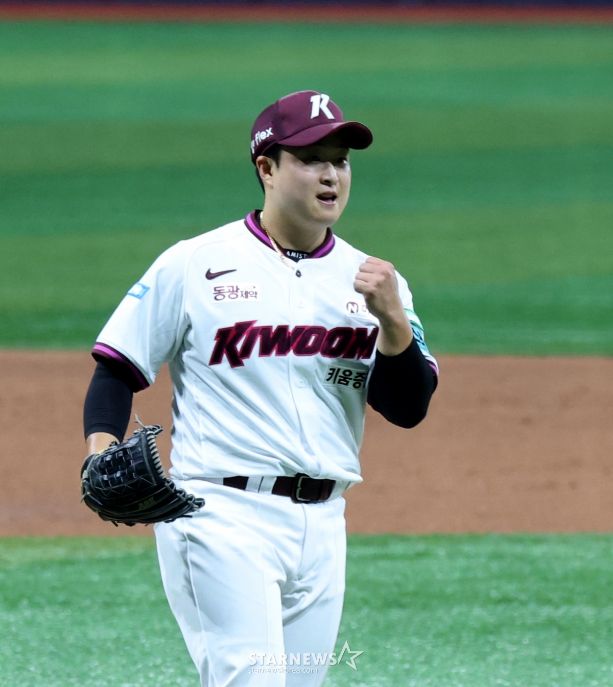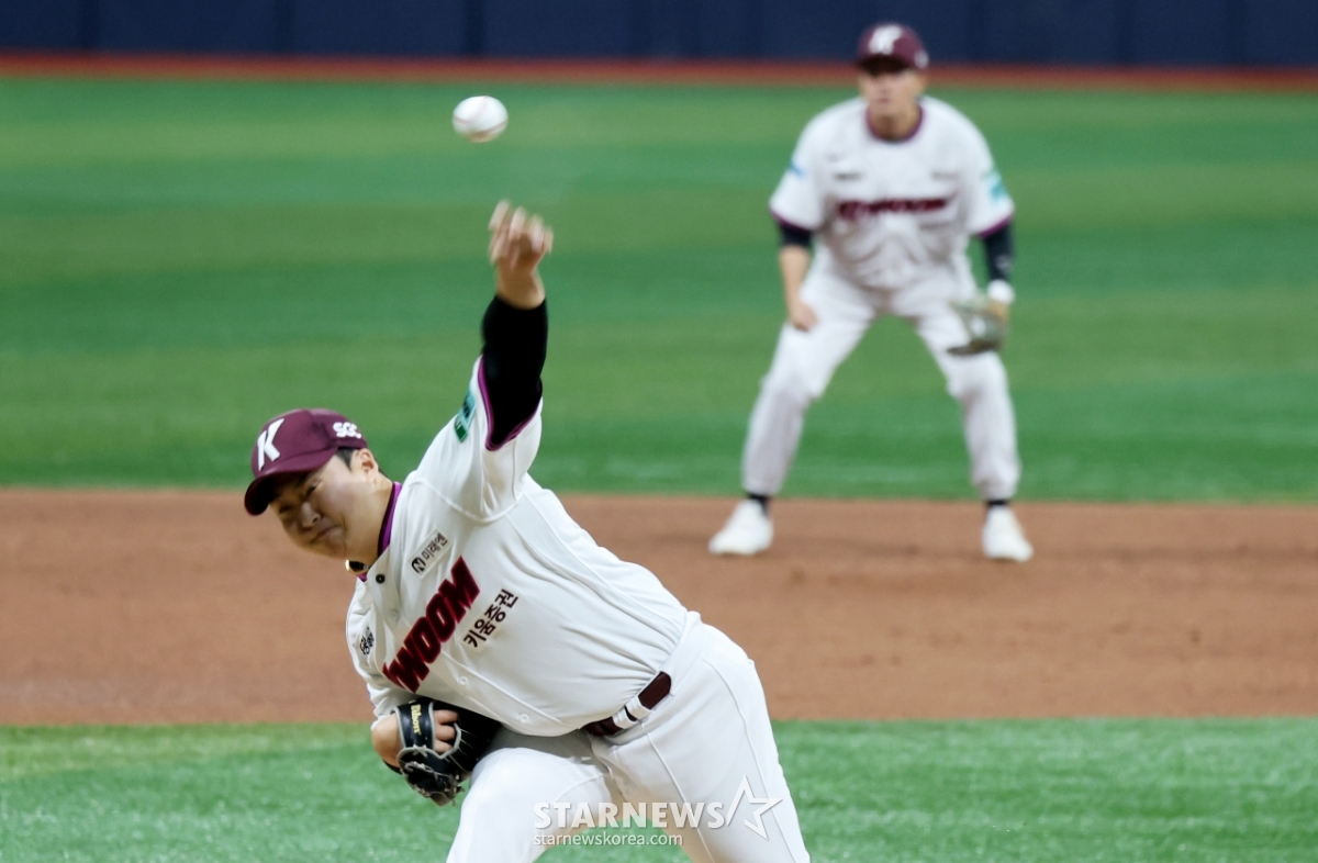 키움 마무리 김재웅이 4일 고척스카이돔에서 열린 2026KBO리그 키움히어로즈와 LG트윈스 경기 9회초 등판해 삼자범퇴로 이닝을 마무리하며 개막전을 승리로 장식하고 있다. 202604.03.