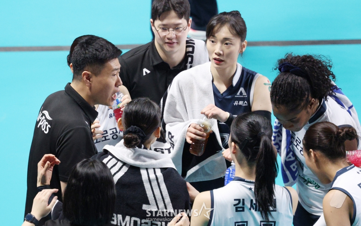 2025-2026 V-리그 포스트시즌 여자 프로배구 챔피언 결정전 3차전 GS칼텍스 대 한국도로공사 경기가 5일 서울 장충체육관에서 열렸다. 한국도로공사 김영래 감독 대행이 작전 지시를 했다. 김영래 감독은 '이대로 갈 순 없잖아'라고 말했다.