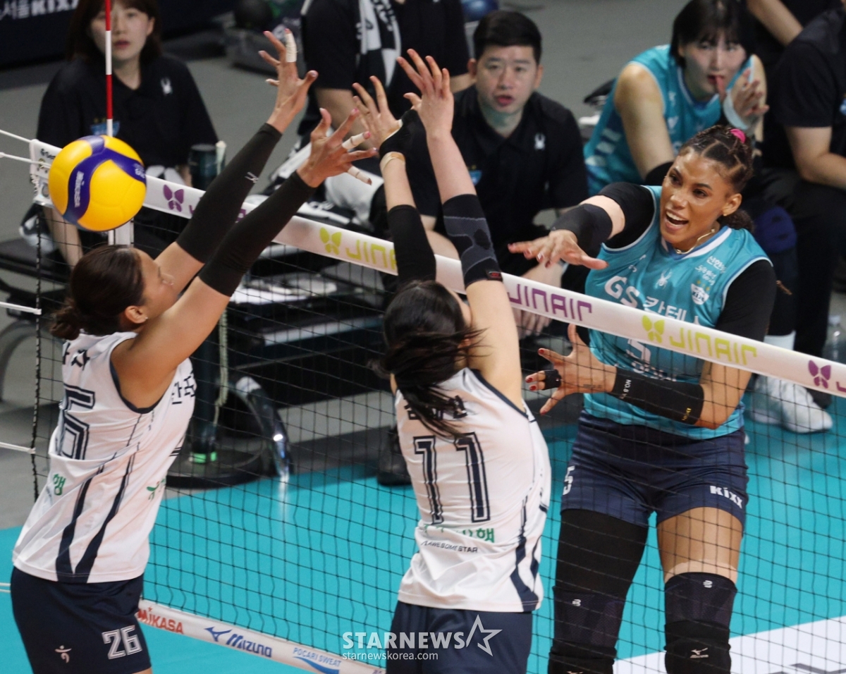 2025-2026 V-리그 포스트시즌 여자 프로배구 챔피언 결정전 3차전 GS칼텍스 대 한국도로공사 경기가 5일 서울 장충체육관에서 열렸다. GS칼텍스 실바는 한국도로공사 타나차, 김세빈의 블로킹 위로 강스파이크를 날렸다. 이 경기는 실바의 압도적인 공격력을 보여주었다.