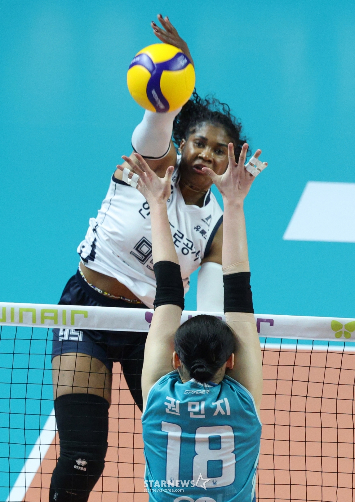 한국도로공사 모마가 GS칼텍스 권민지의 블로킹 위로 강스파이크를 날리고 있다.