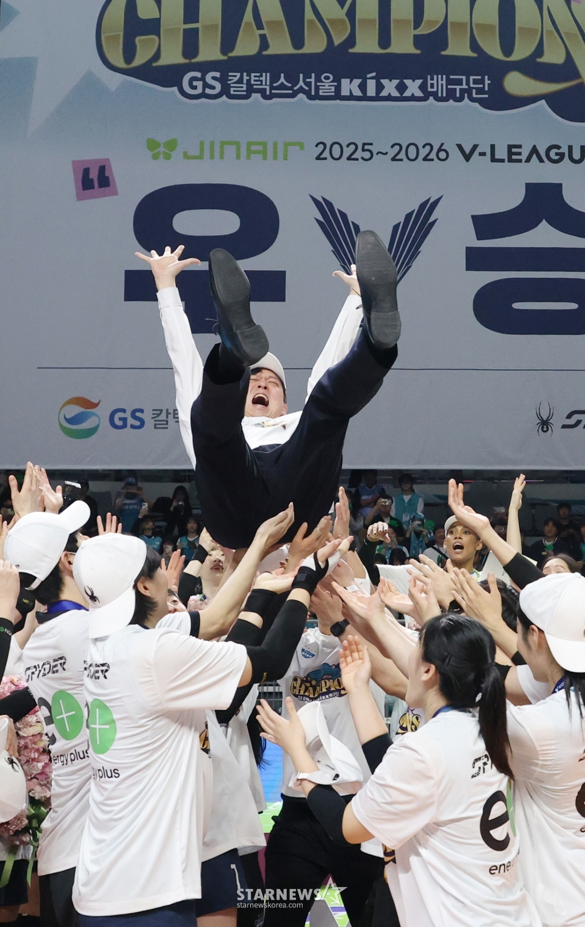 2025-2026 V-리그 포스트시즌 여자 프로배구 챔피언 결정전 3차전 GS칼텍스 대 한국도로공사 경기가 5일 서울 장충체육관에서 열렸다. GS칼텍스 선수들이 우승을 차지했다. 우승 후 선수들은 이영택 감독을 헹가래쳤다.