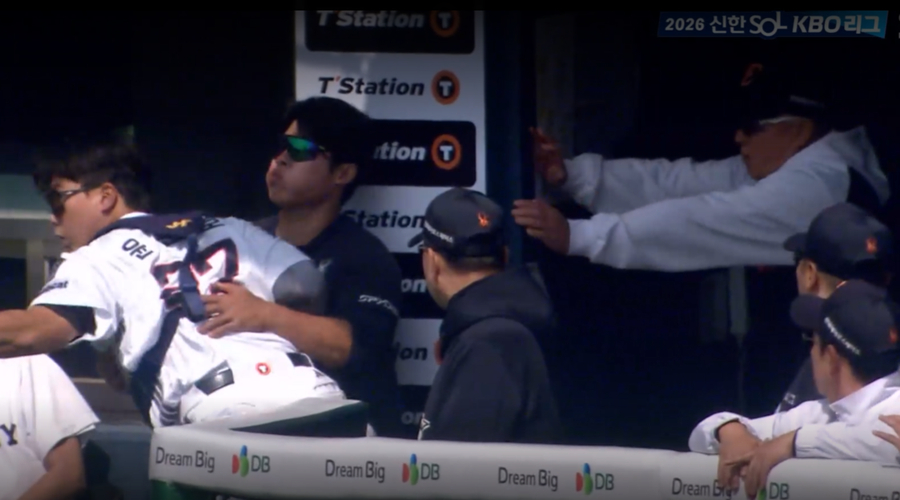 # 지난 4일 잠실 두산-한화전. 1회초 한화 공격 무사 2루에서 노시환의 타구가 포수 뒤 파울 지역으로 높이 떠올랐다. 두산 포수 윤준호는 3루 더그아웃 입구 바로 앞까지 달려가 공을 잡아냈다. 하마터면 더그아웃 설치물에 부딪히거나 안으로 넘어질 수도 있었던 위험천만한 순간이었다. 이때 TV 중계화면에는 상대팀 한화의 김경문 감독이 깜짝 놀라며 팔을 내밀어 윤준호를 보호하려 하는 모습이 포착됐다.