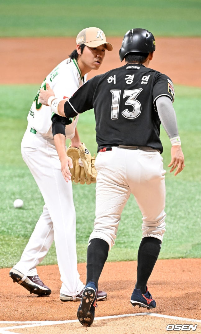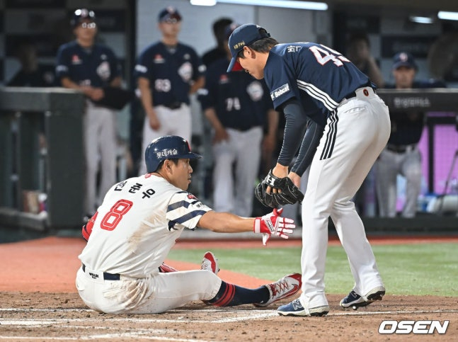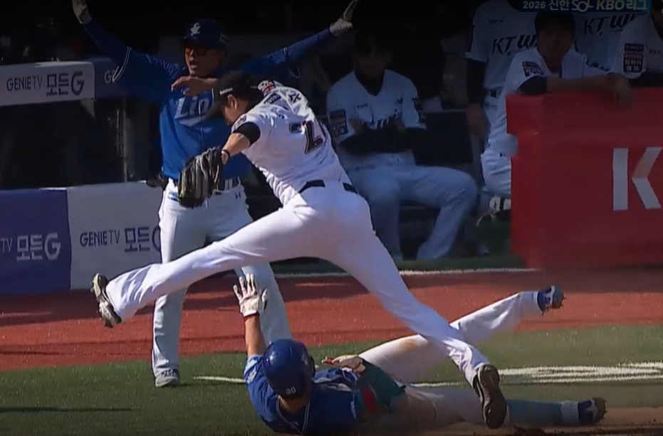 # 이튿날인 5일 수원 경기에서도 훈훈한 장면이 연출됐다. 7회초 1사 후 삼성 김영웅의 땅볼이 KT 1루수 김현수의 미트에 맞고 흐르자 2루수 김상수가 잡아냈고, 김영웅은 1루에 헤드 퍼스트 슬라이딩을 했다. 이때 1루 베이스 커버에 들어가 김상수의 송구를 잡은 투수 김민수는 김영웅을 밟지 않도록 껑충 뛰어오르다 중심을 잃고 몸을 굴렀다. 김영웅은 곧바로 김민수에게 다가가 상태를 살폈고, 김민수는 다행히 큰 부상은 아니어서 투구를 이어갈 수 있었다.